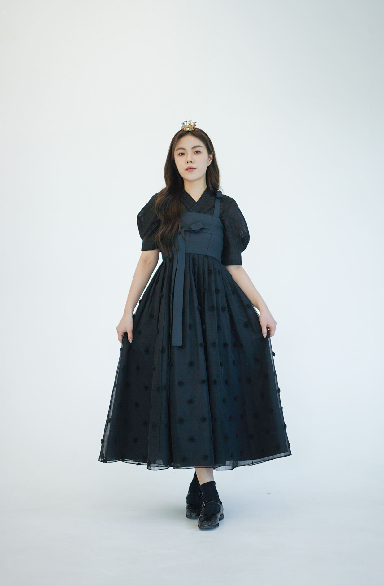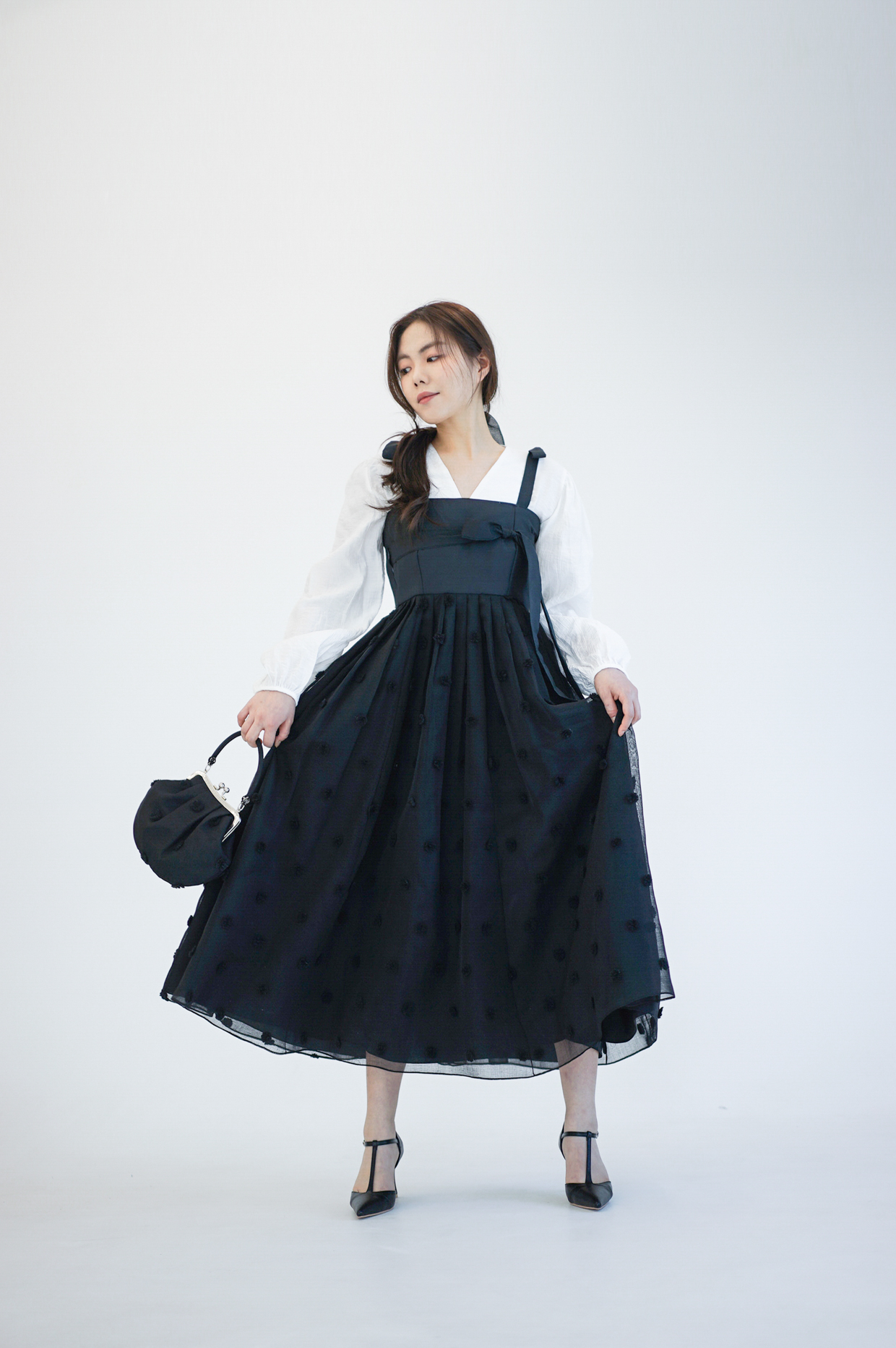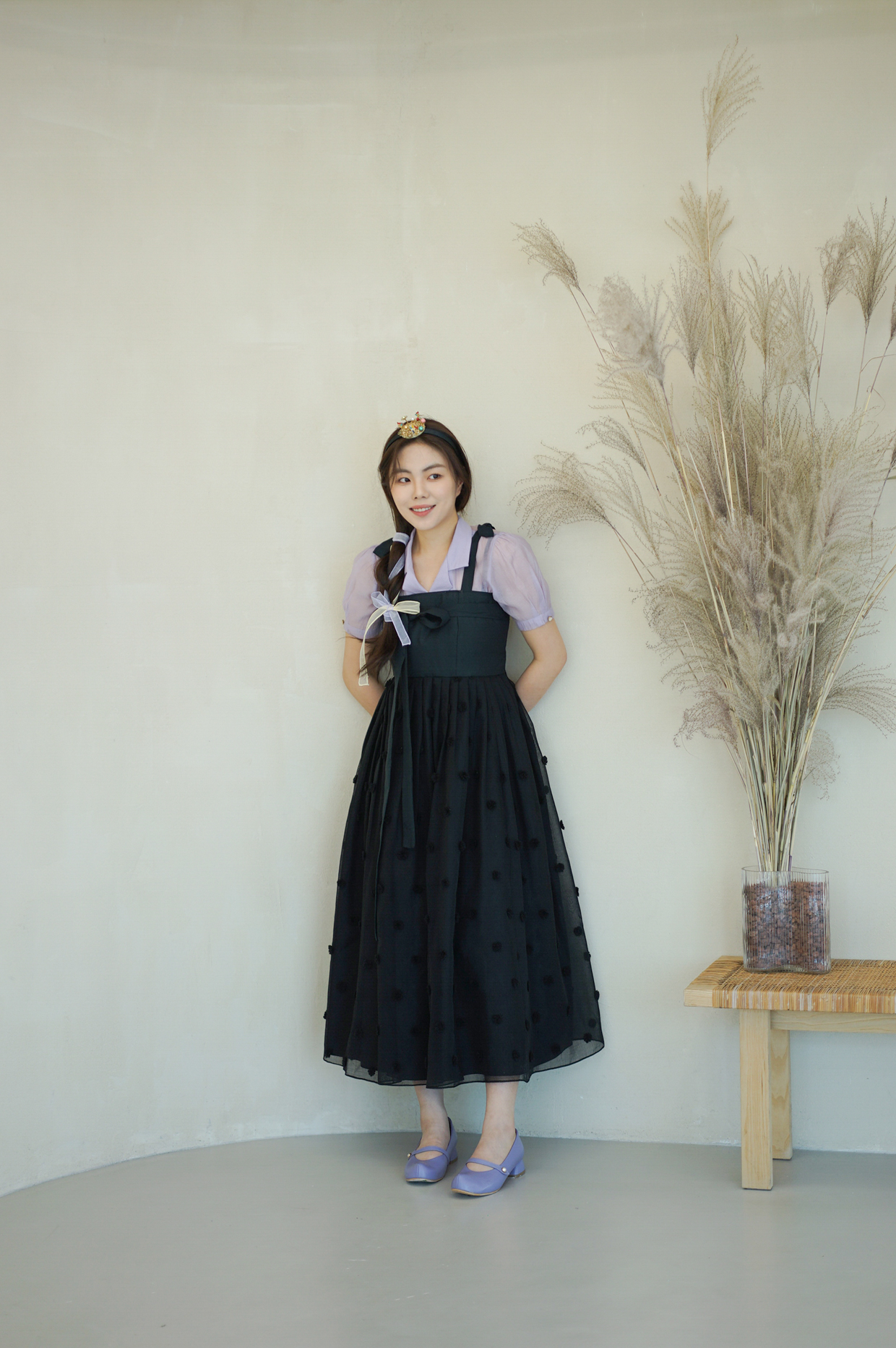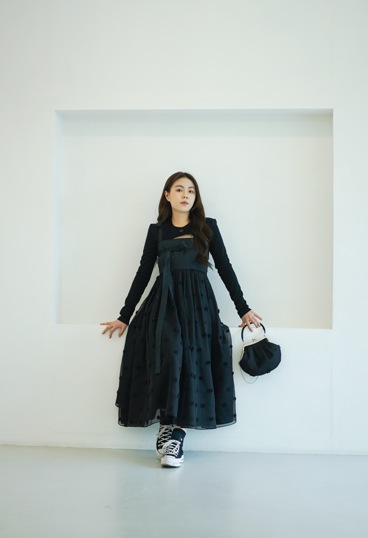 조선 후기에 나타난 짧은 가슴선과 길어진 허리선의 실루엣을 모티브로 디자인된 원피스입니다.