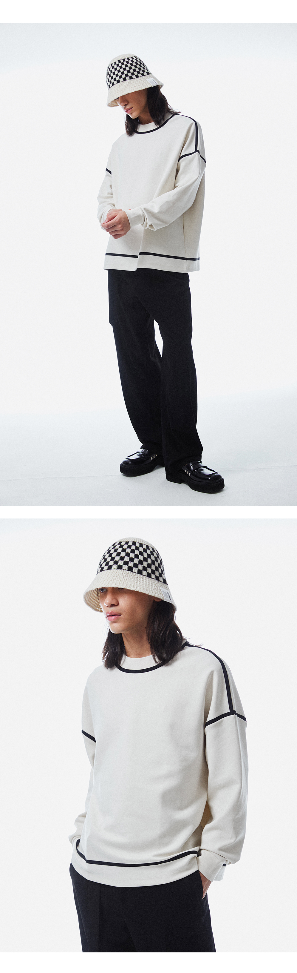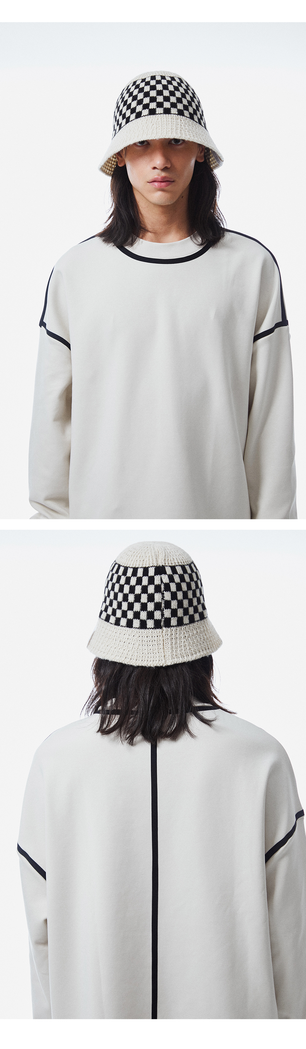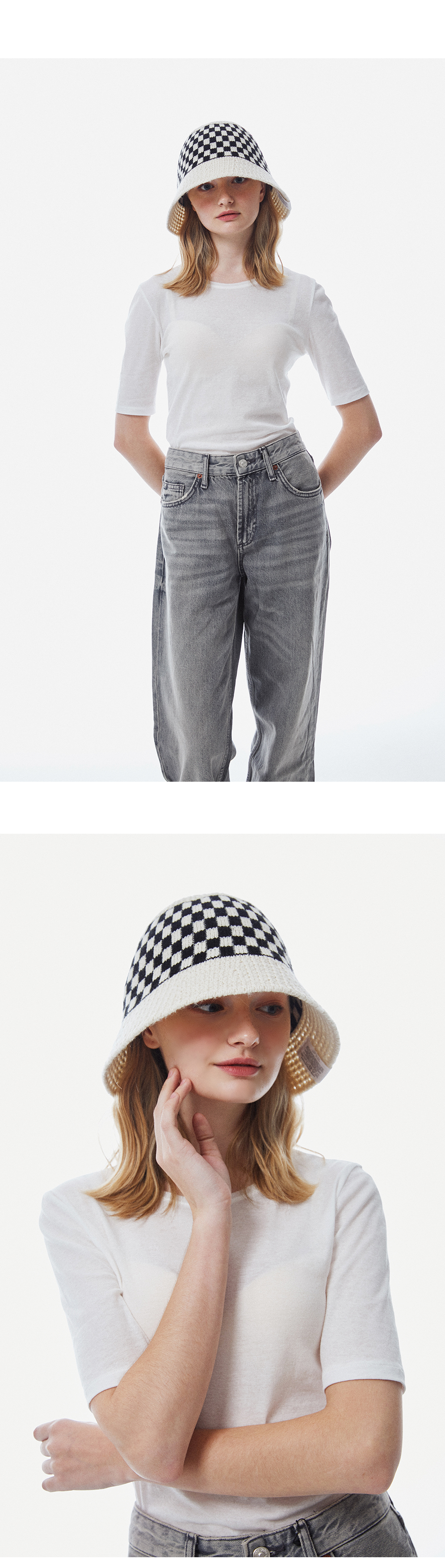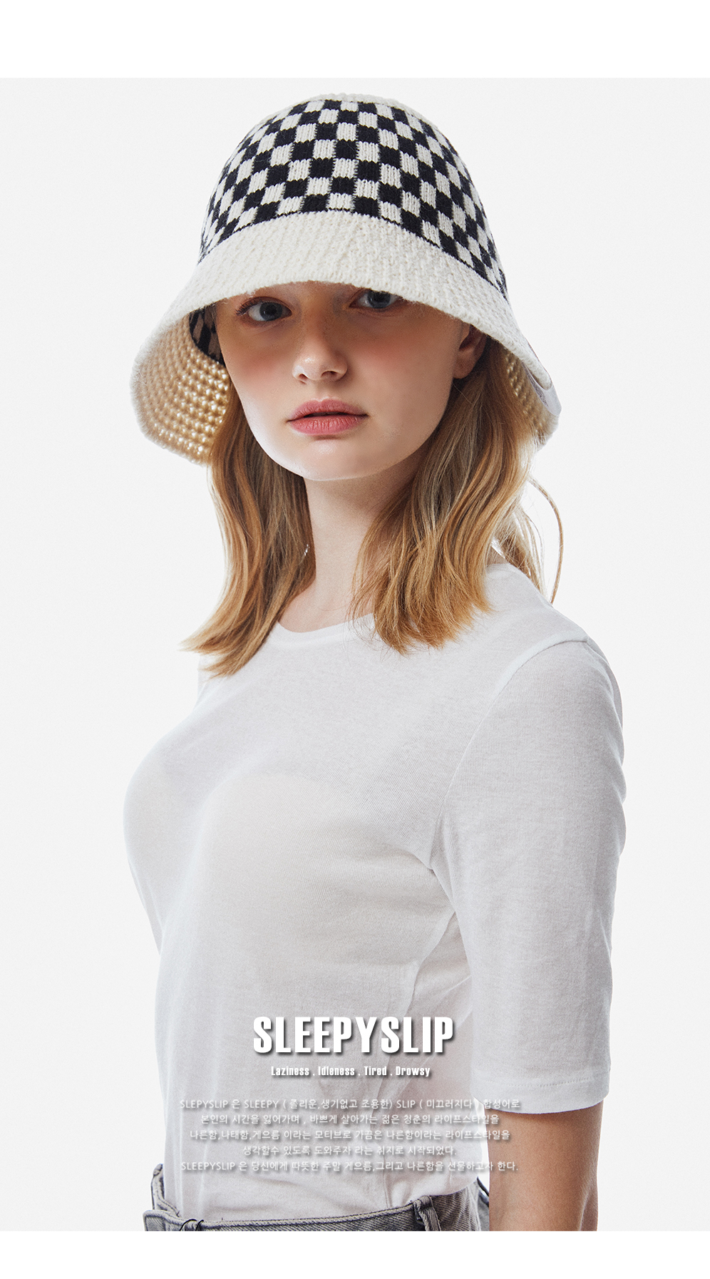 스트링 디테일로 안정감 있게 착용되는 니트 비치 버킷햇
