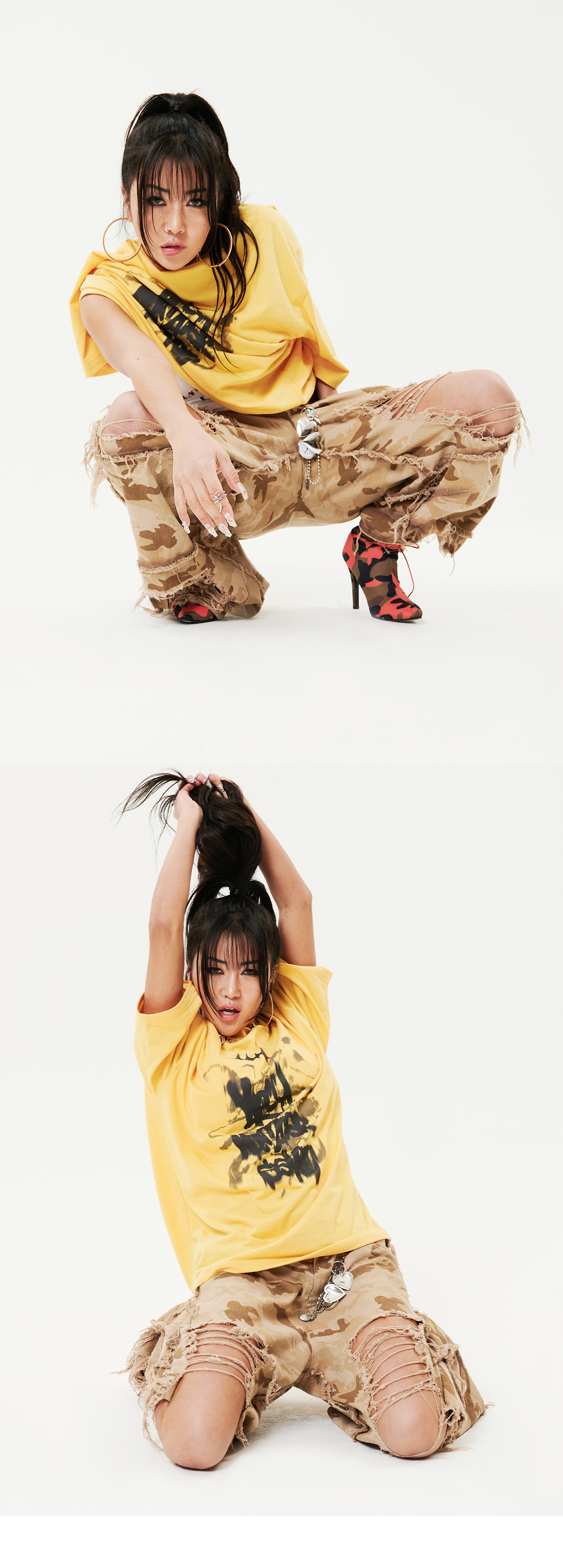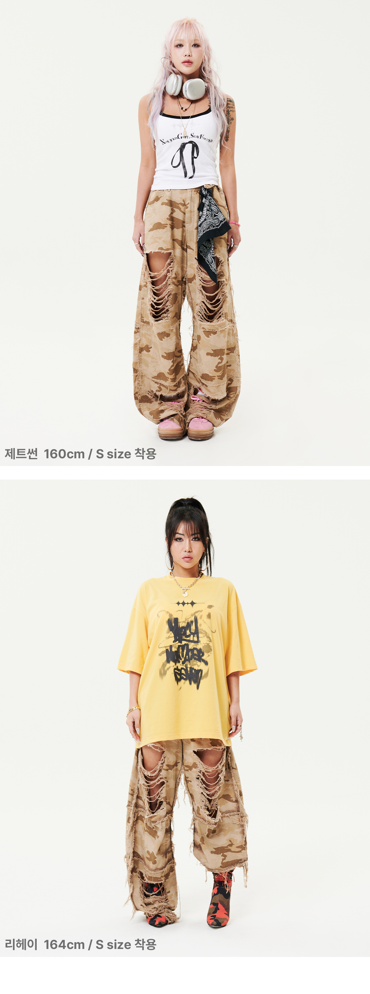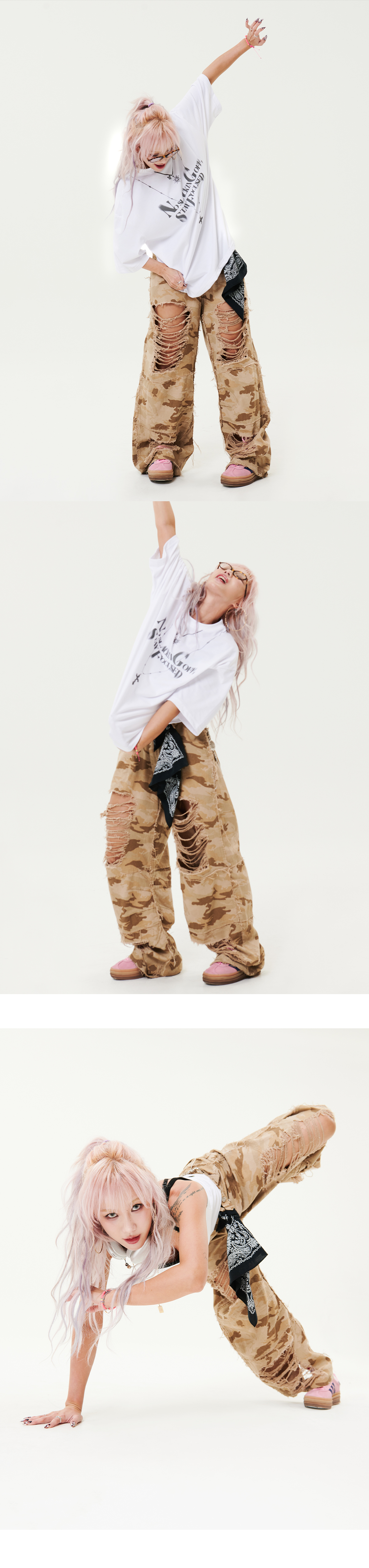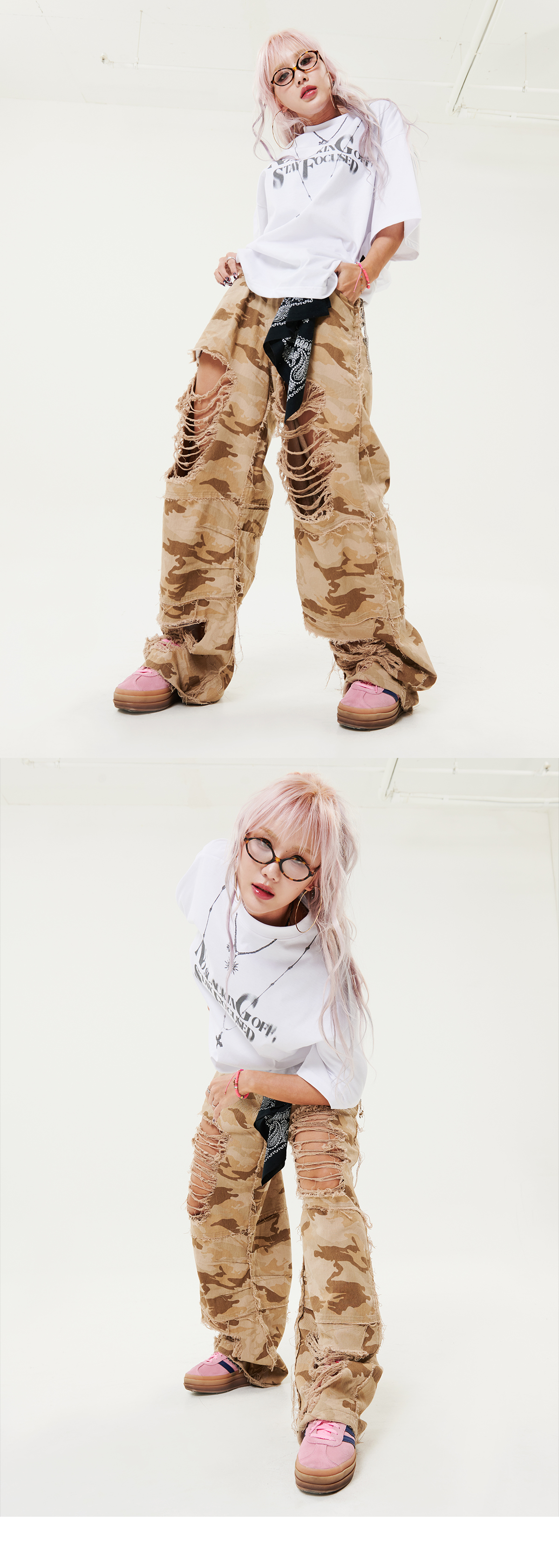 메쉬 원단,우드랜드 패턴의 와이드한 핏의 조거 팬츠
