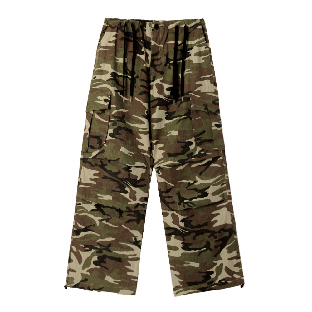 메쉬 원단,타이거 카모 패턴의 와이드한 핏의 조거 팬츠