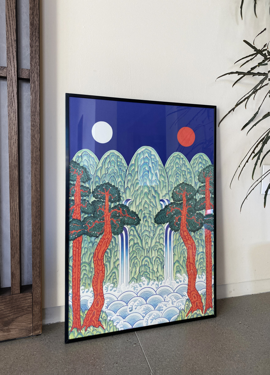 흰 달과 붉은 해가 좌우에 떠 있다.