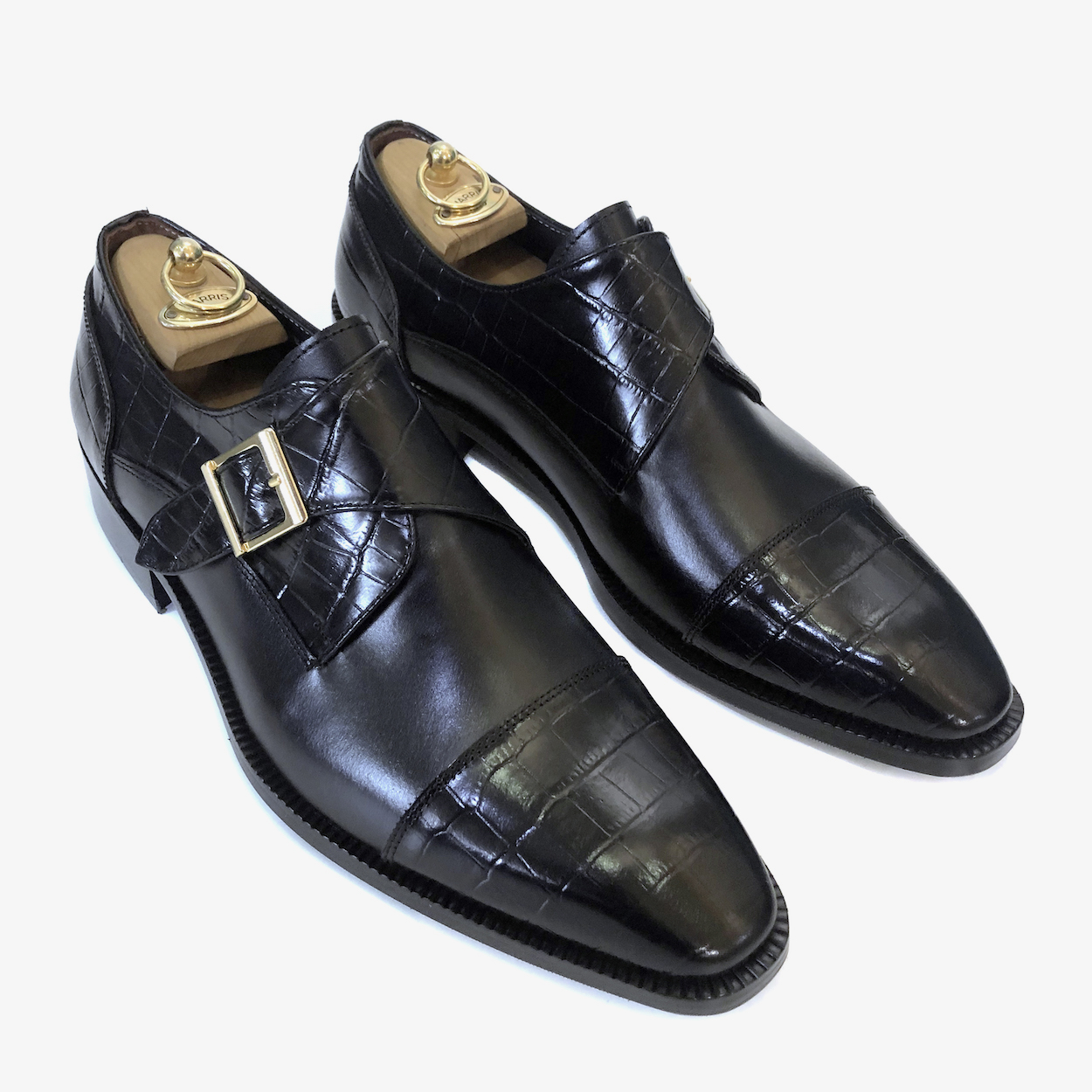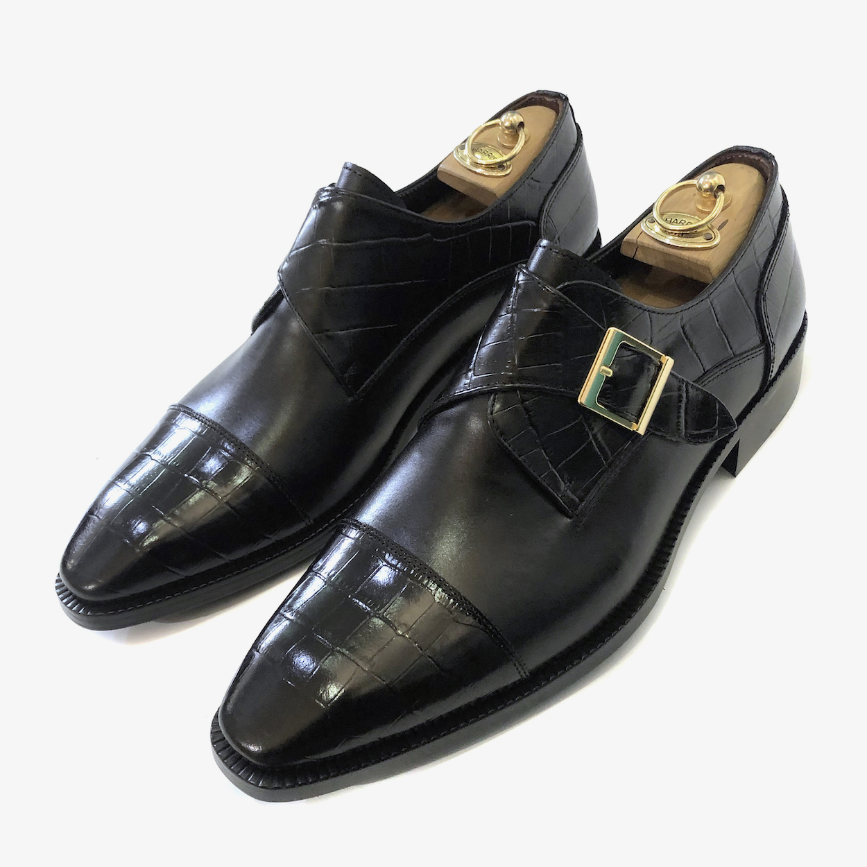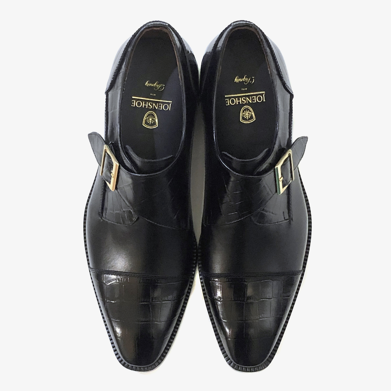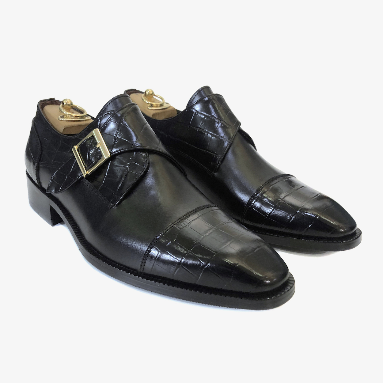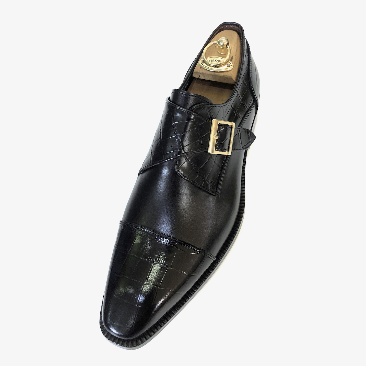 : 앞코와 버클 덮개 부분에 크로커다일 패턴 소가죽을 사용하여 독특한 질감을 줍니다.