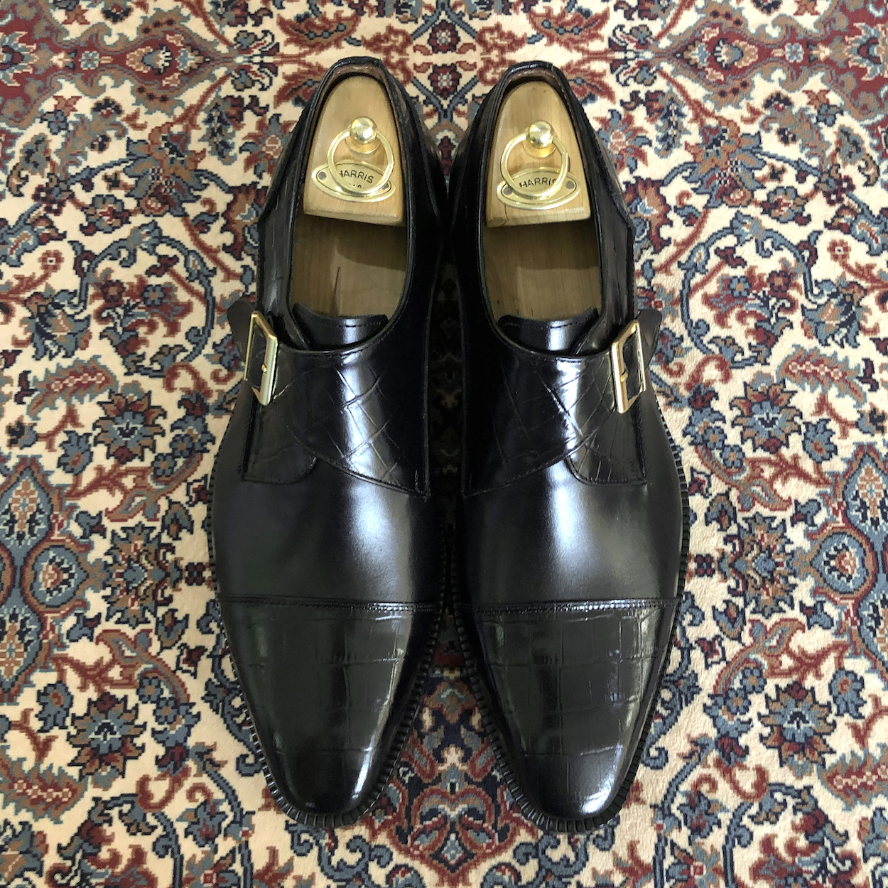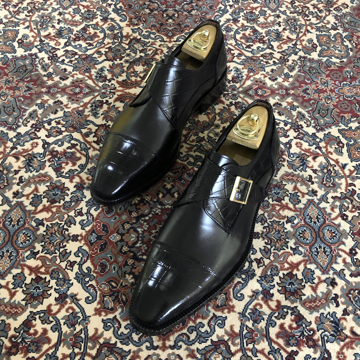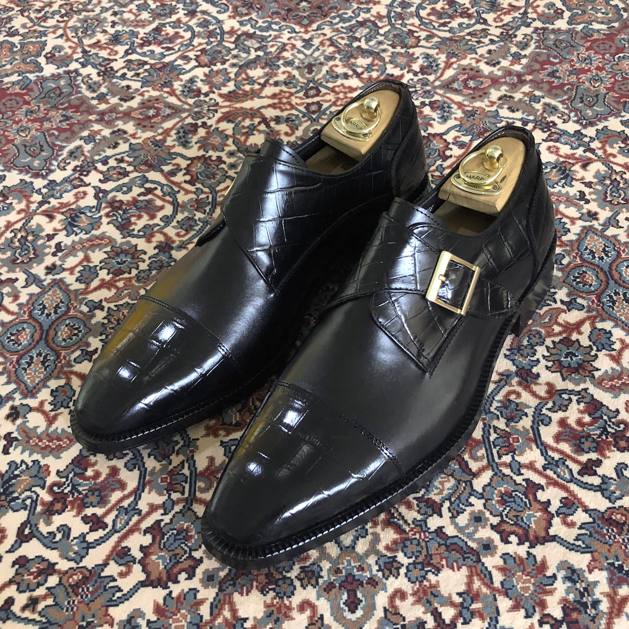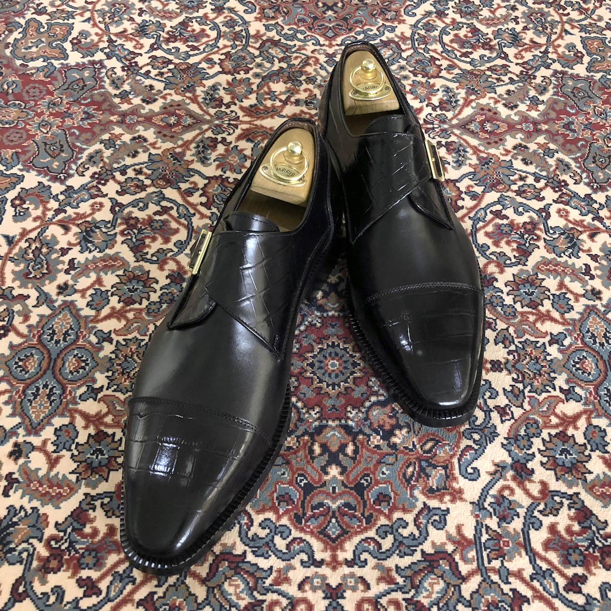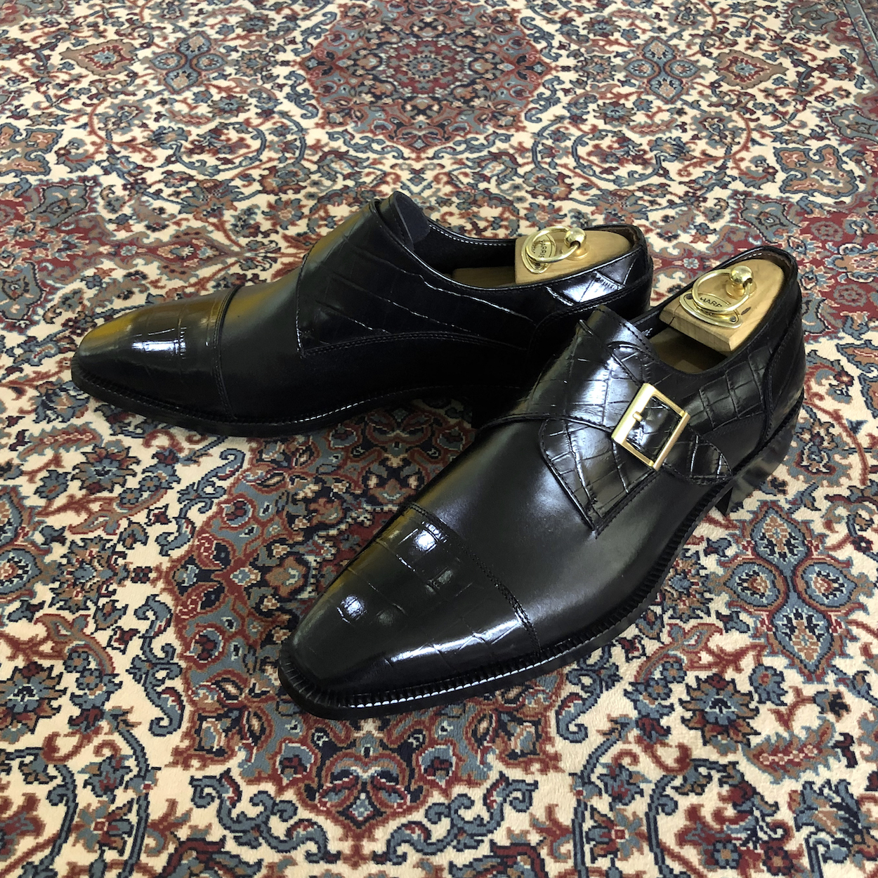 : 앞코와 버클 덮개 부분에 크로커다일 패턴 소가죽을 사용하여 독특한 질감을 줍니다.
