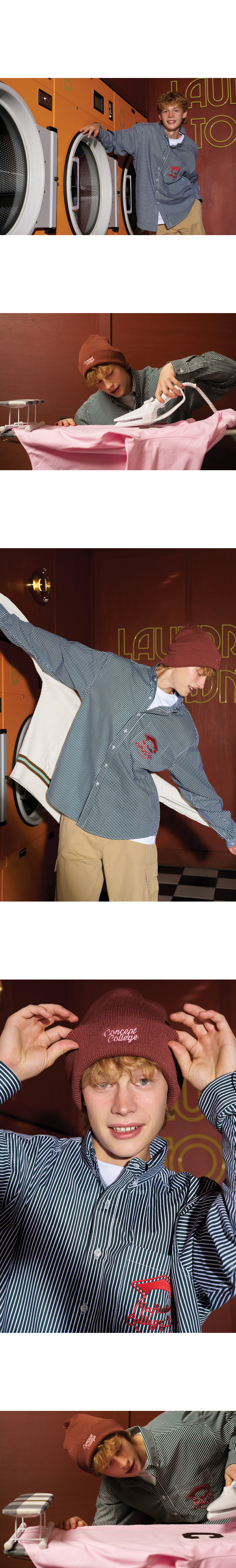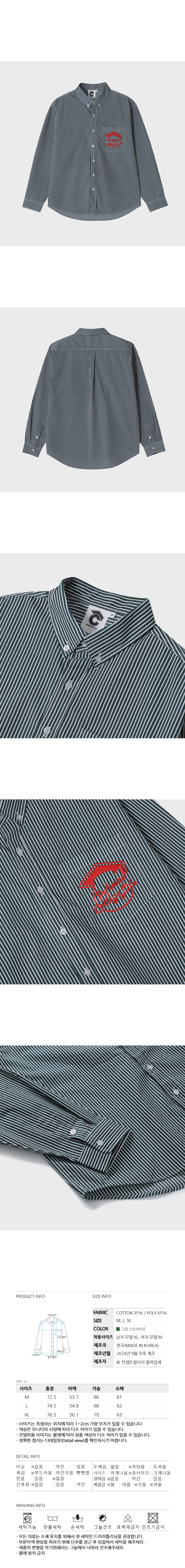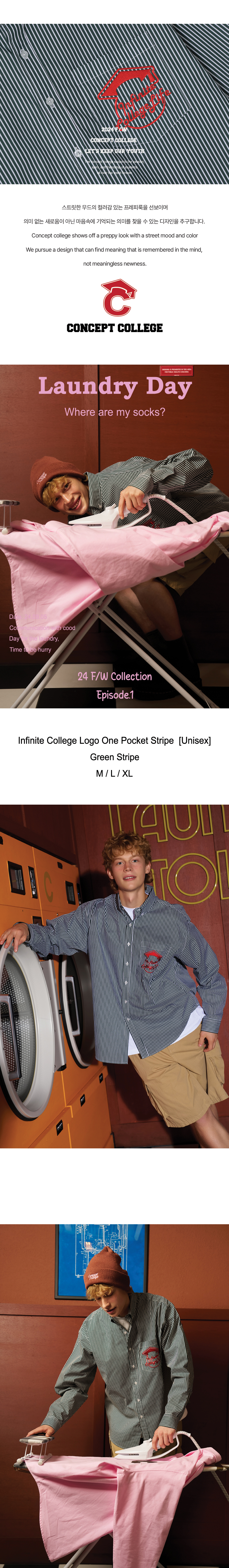 인피닛 컬리지 라이프 학사모 자수가 유니크함을 더한 세미 캐주얼한 스트라이프 셔츠입니다.