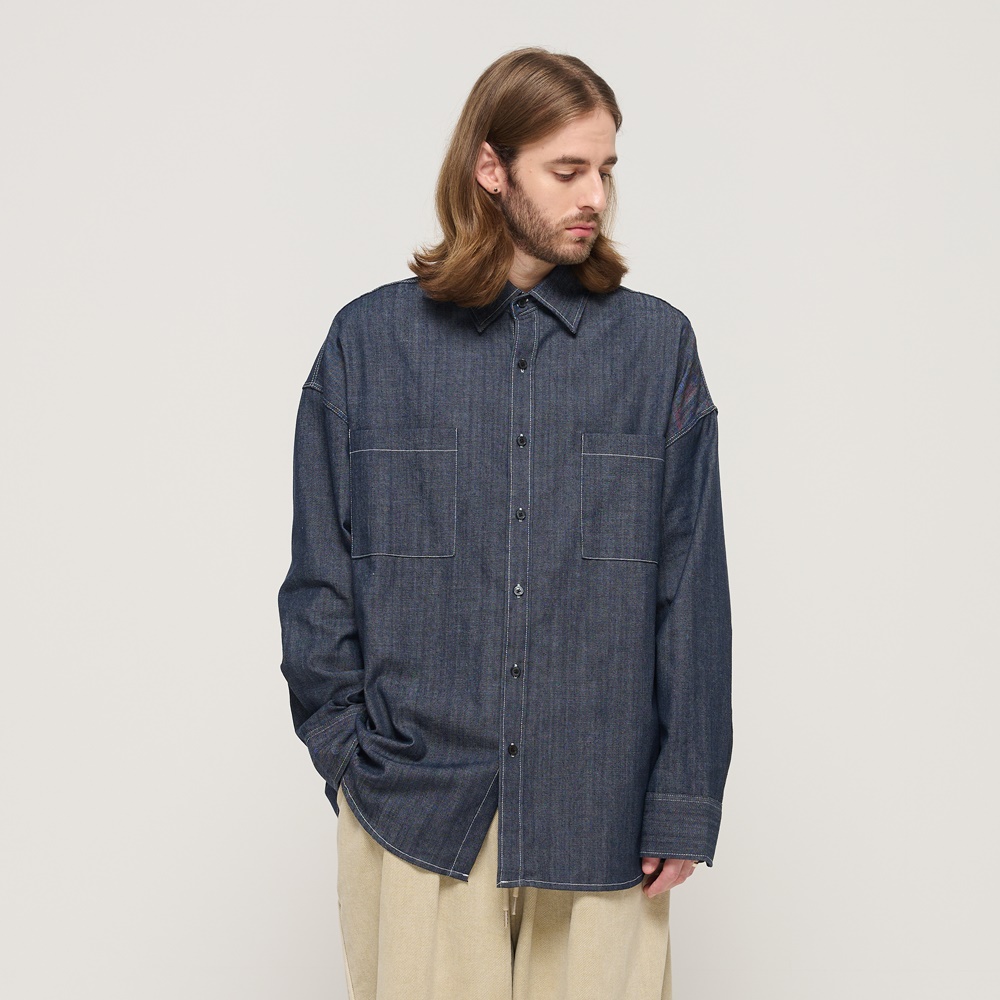 데님 소재로 제작된 오버핏의 플리츠 셔츠