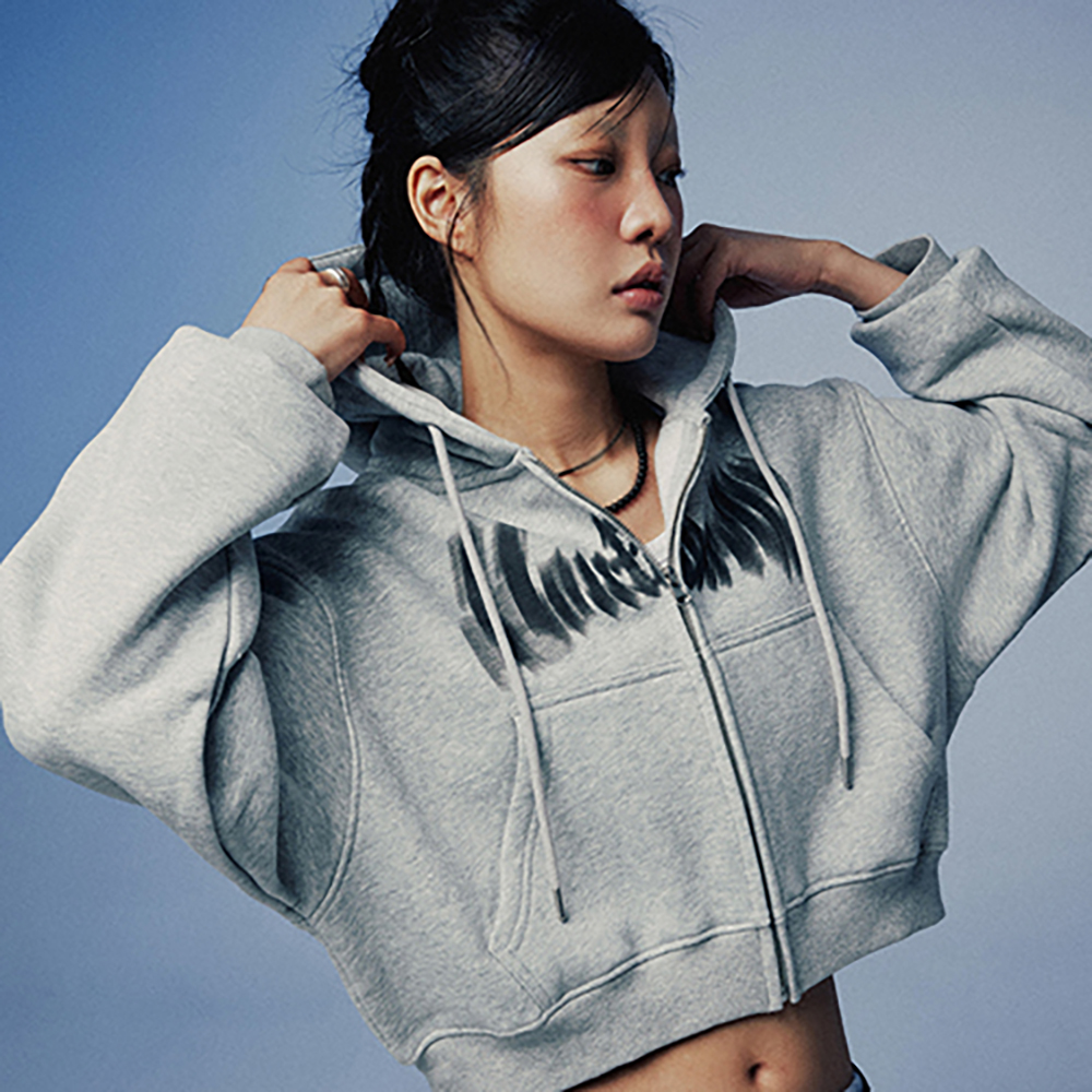 리사이클 소재의 세미크롭 기장 크롭 후드 집업