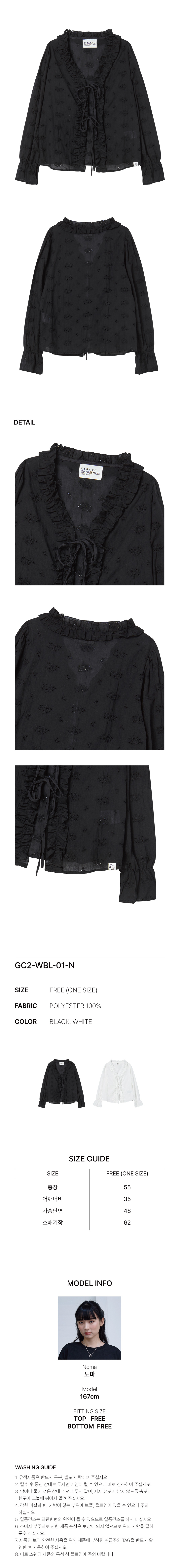 네크를 따라 흐르는 러플과 시스루한 소재가 여성스러운 느낌을 주는 블라우스예요.