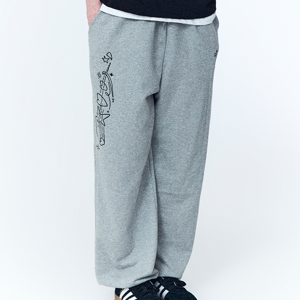 와이드한 패턴으로 볼륨감 있게 연출되며 전면에 그래픽 디자인이 매력적인 스웨트 팬츠입니다.
