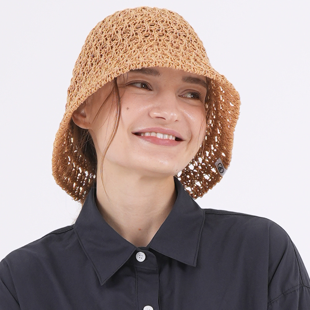 스트링 디테일로 안정감 있게 착용되는 니트 비치 버킷햇