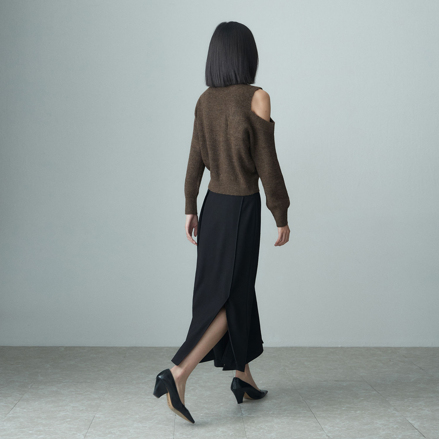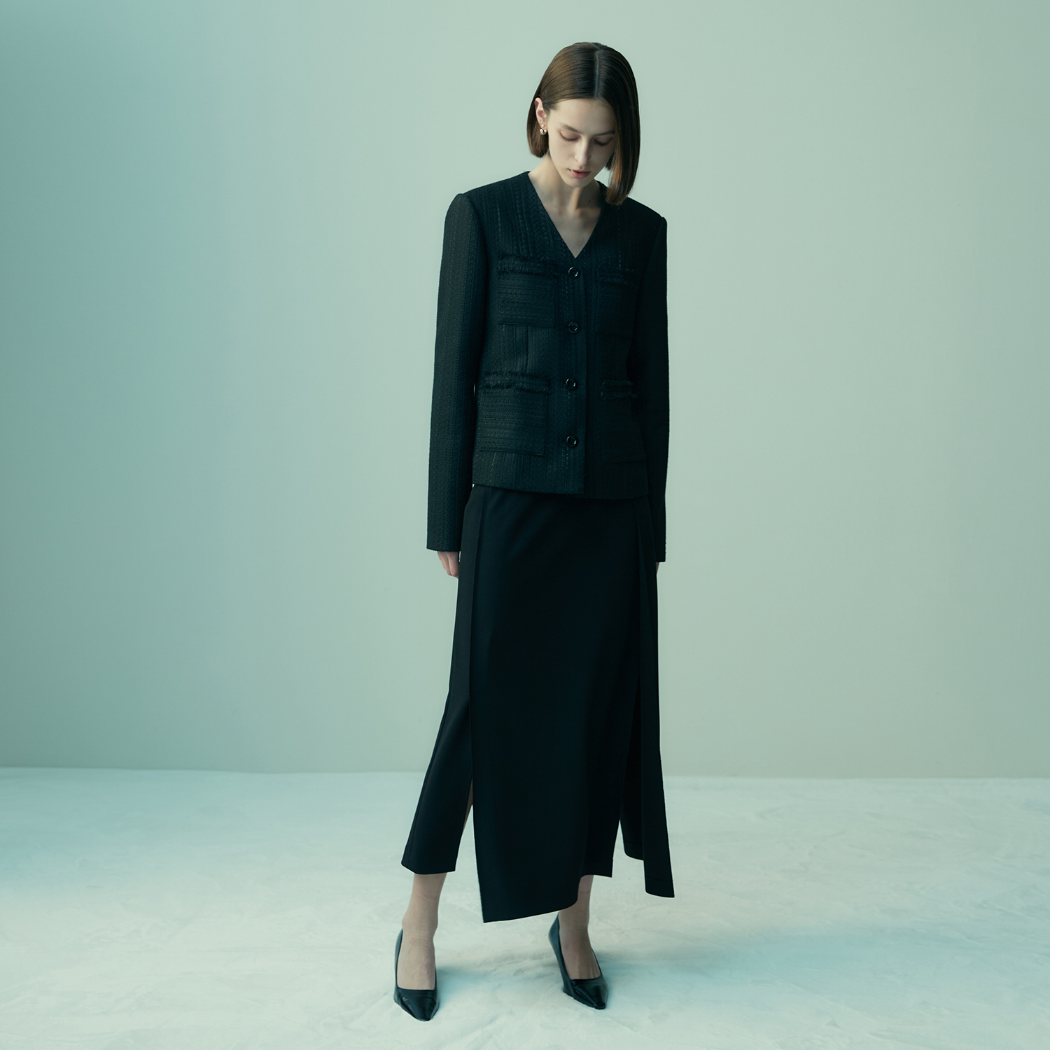 각각 다른 길이의 패널과 슬릿 포인트가 매력적인 에센셜한 실루엣의 블랙 스커트로, 걸을 때마다 돋보이는 슬릿의 움직임이 유니크하고 스타일리시한 느낌을 줍니다.