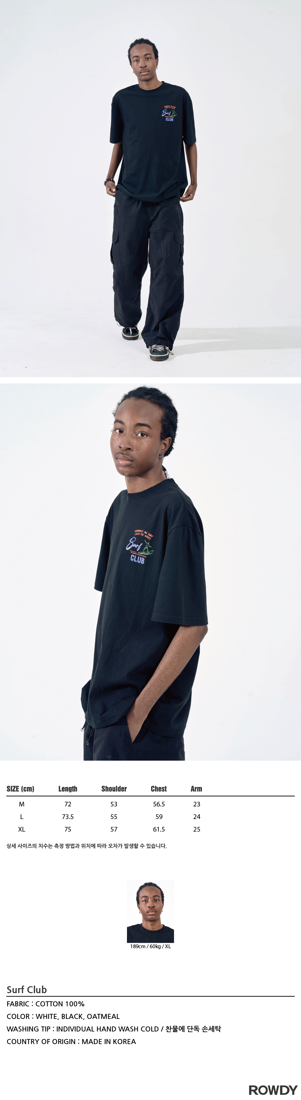 - 남성모델 : 189 / 60 XL사이즈 착용