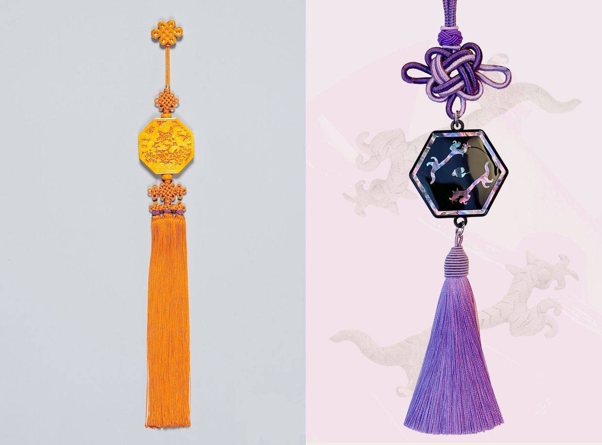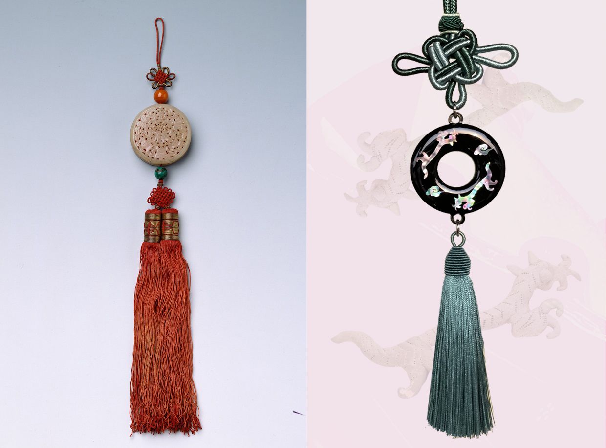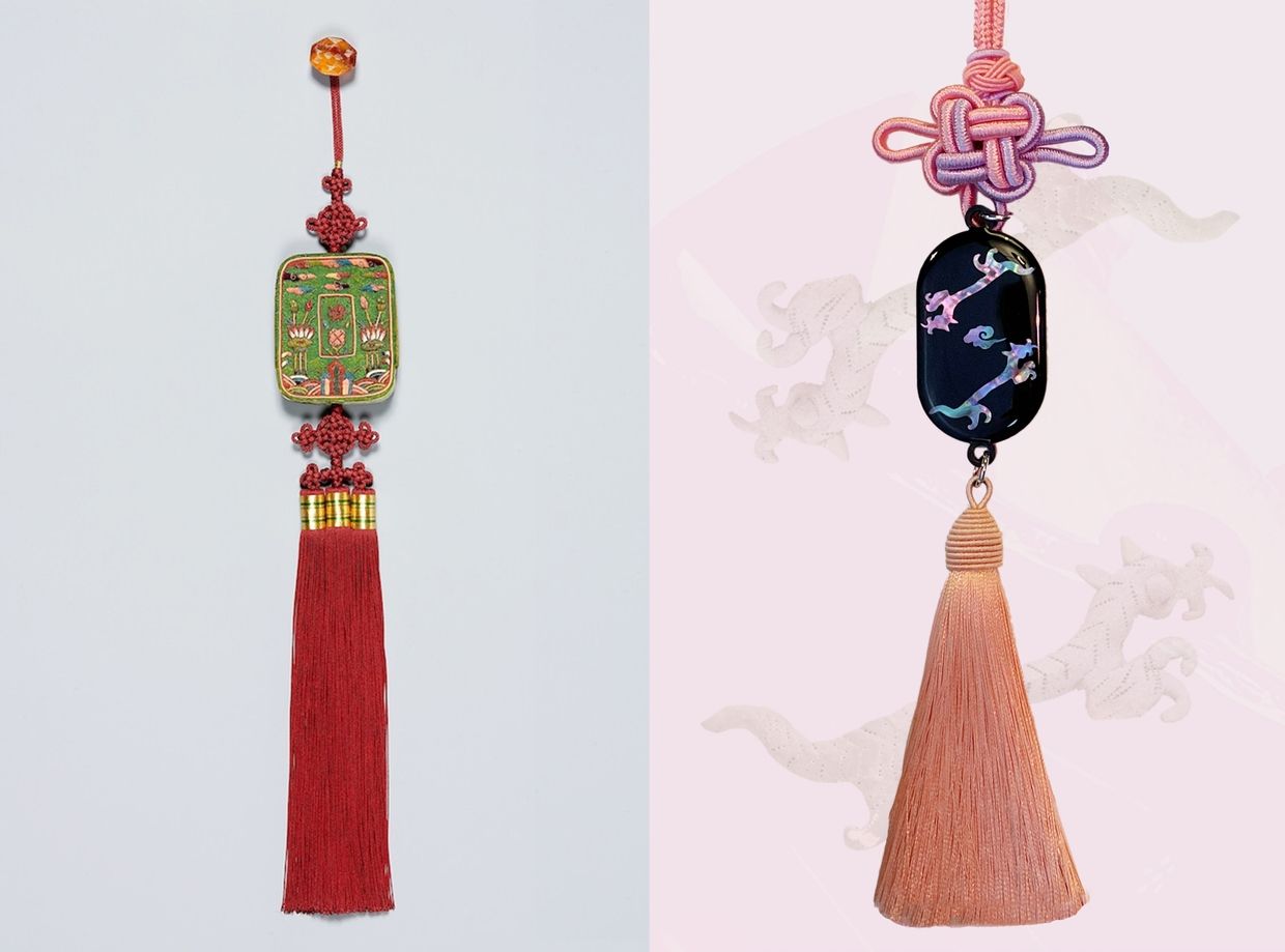용의 빛깔을 담은 자개와 복숭앗빛을 머금은 도화색의 비단술로 마무리한 노리개입니다. 왼쪽 <수향갑 노리개 (출처: 국립중앙박물관)> / 오른쪽 <희뮤즈 도화 노리개>
