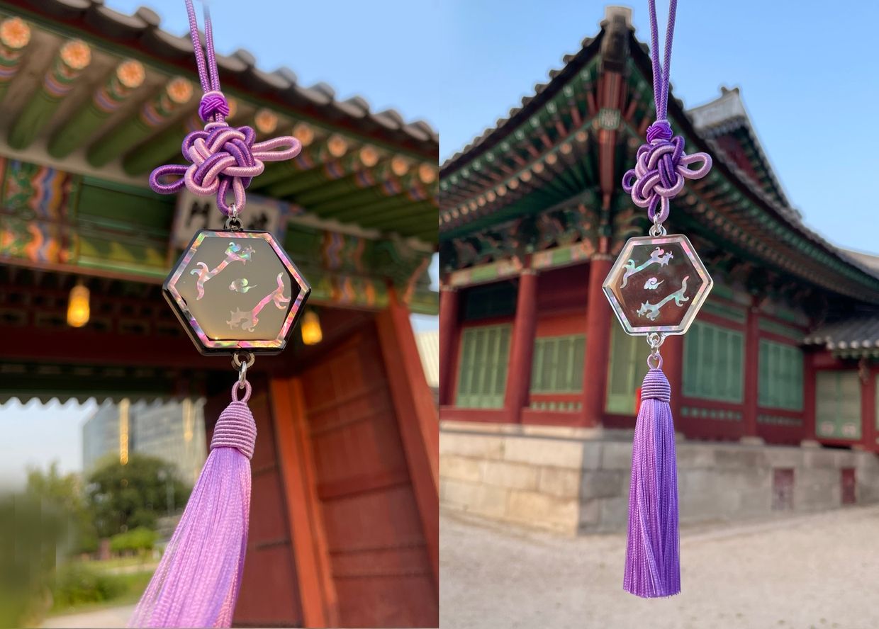 용의 빛깔을 담은 자개연보랏빛 구름이 연상되는 비단술로 마무리한 노리개입니다. 왼쪽 <백옥향갑 노리개 (출처: 국립중앙박물관)> / 오른쪽 <희뮤즈 연보라 노리개>