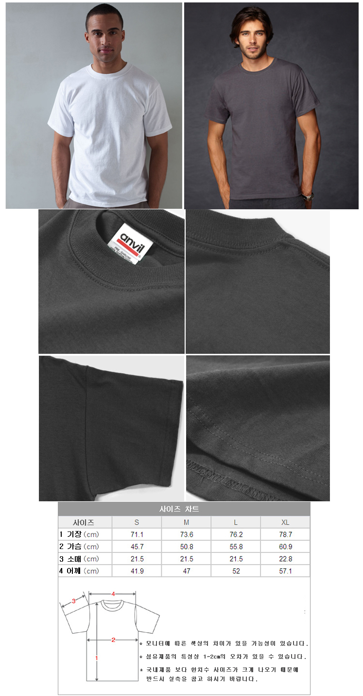 미국에서 NO.1 점유율을 획득하고있는 앤빌사 (anvil)의 무지 T 셔츠 입니다. 미국제품 특유의 감촉과 튼튼함이 있습니다. 천의 두께는 헤비 웨이트에 분류되는 6.1 온즈 입니다. -anvil 티셔츠는 목부분과 소매와 밑단이 더블 스티치 (이중 박음질) 되어 쉽게 늘어나지 않습니다.-