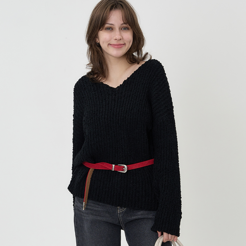 사선 플랩 형태의 비대칭 넥라인 디자인의 페미닌한 니트입니다.