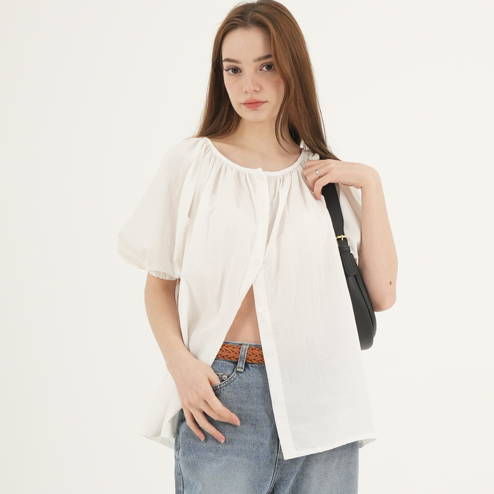 사랑스러운 룩의 완성도를 높이는 셔링 디테일 반팔 셔츠