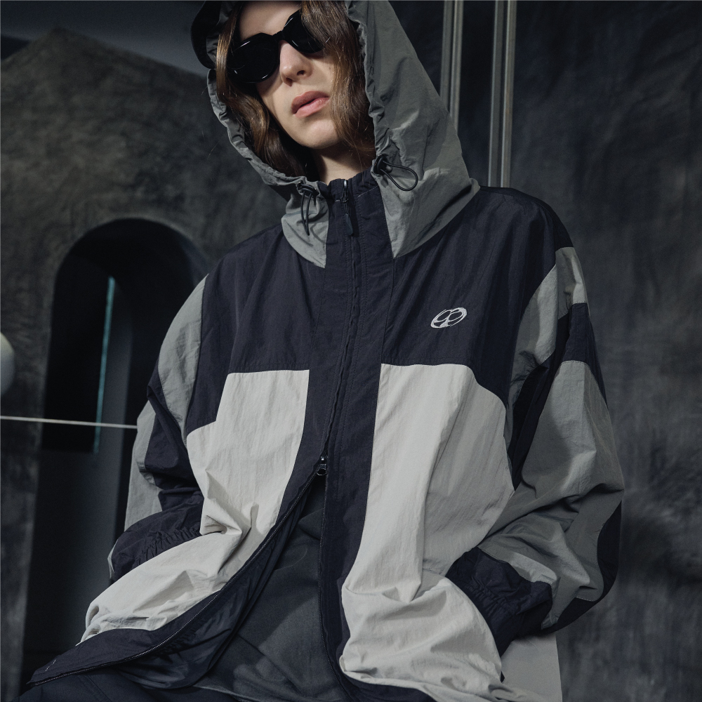 믹스드 절개 디자인의 윈드 브레이커입니다.