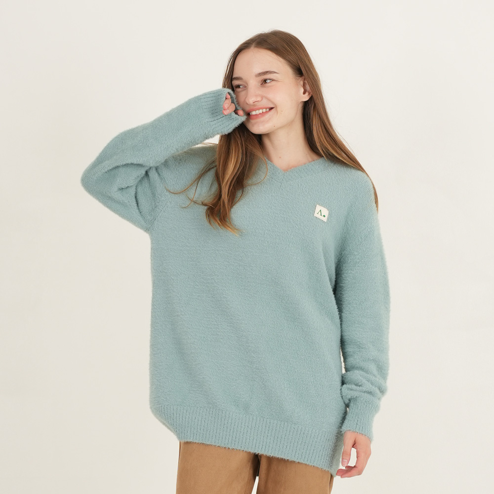 사선 플랩 형태의 비대칭 넥라인 디자인의 페미닌한 니트입니다.