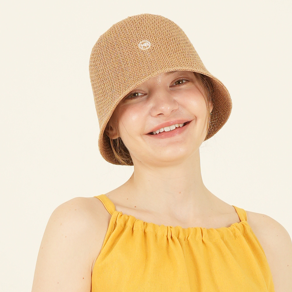 스트링 디테일로 안정감 있게 착용되는 니트 비치 버킷햇