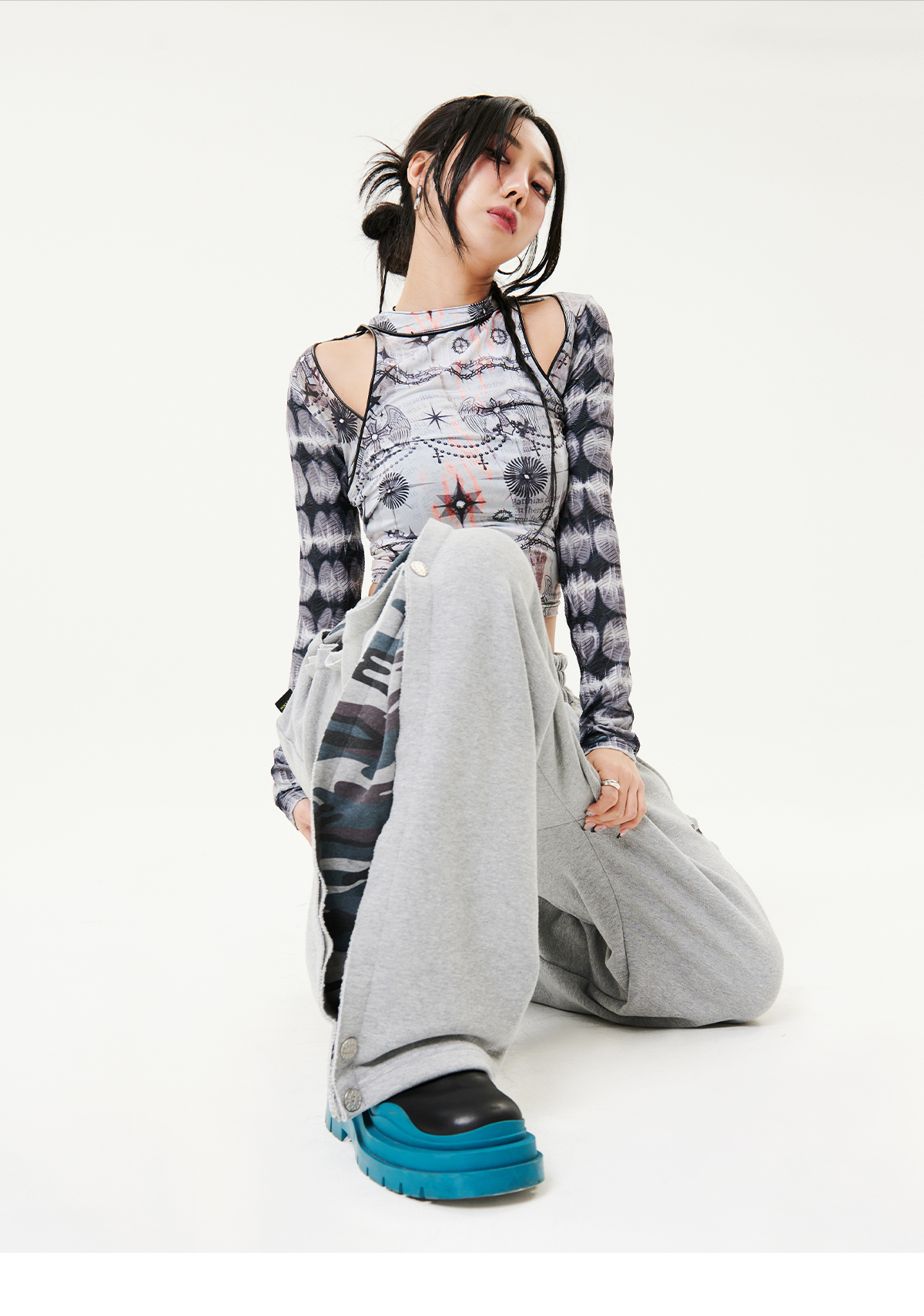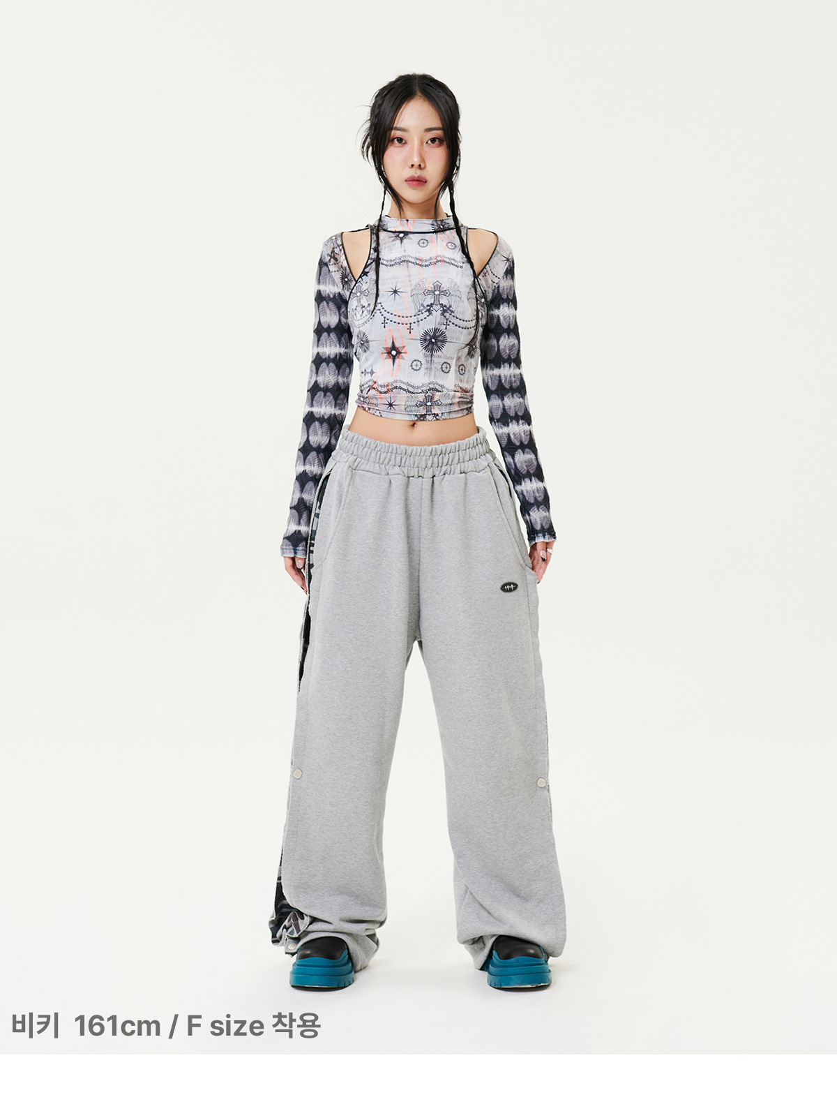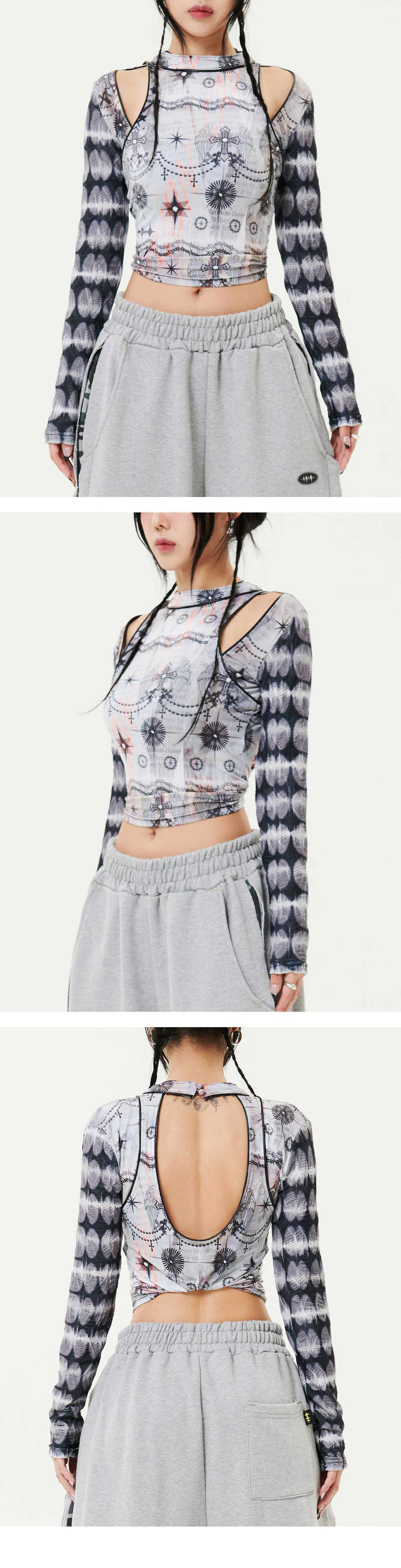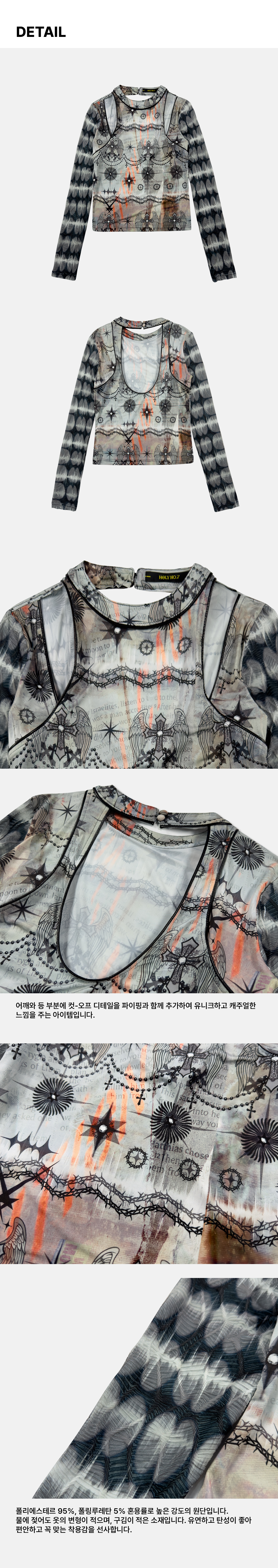 보트넥 라인의 그래픽이 프린팅된 시스루 티셔츠입니다.