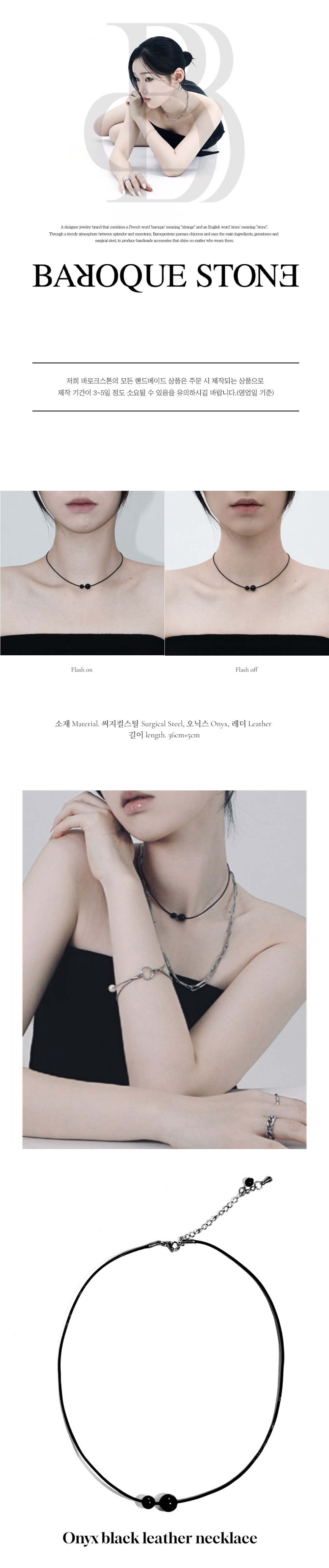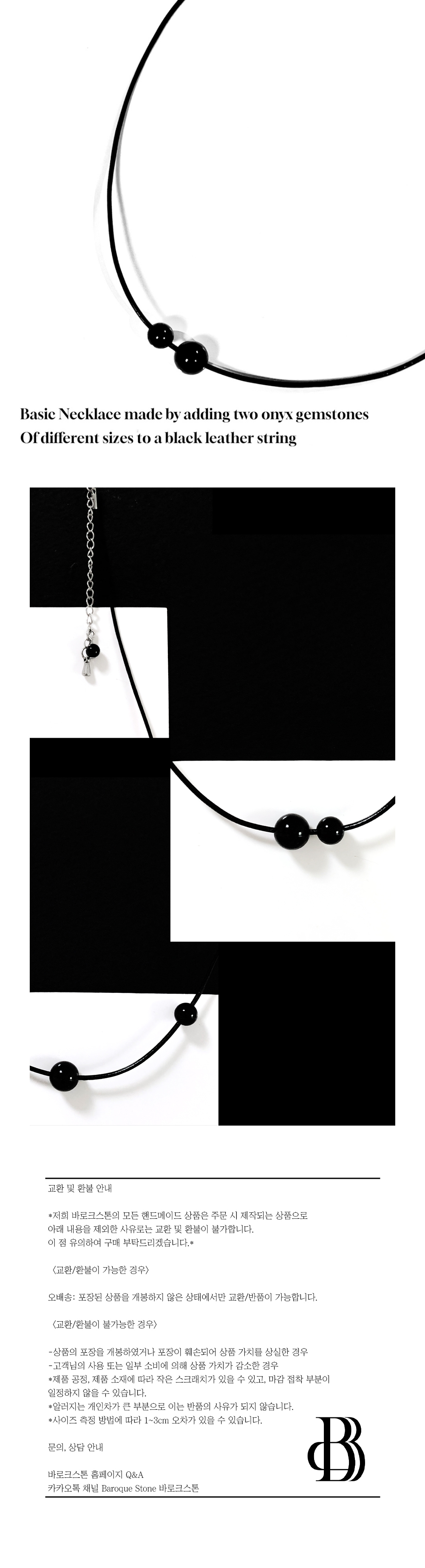 블랙 색상의 가죽 줄에 크기가 다른 두 오닉스 원석을 추가하여 만든 베이직 네크리스
