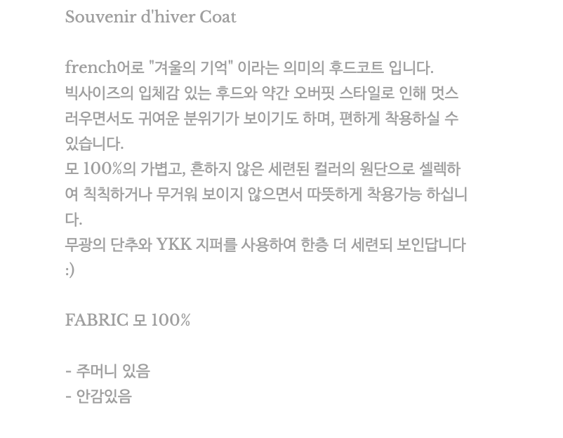 모헤어 소재를 사용해 부드럽고 따뜻한 여유로운 핏의 하프 코트입니다.