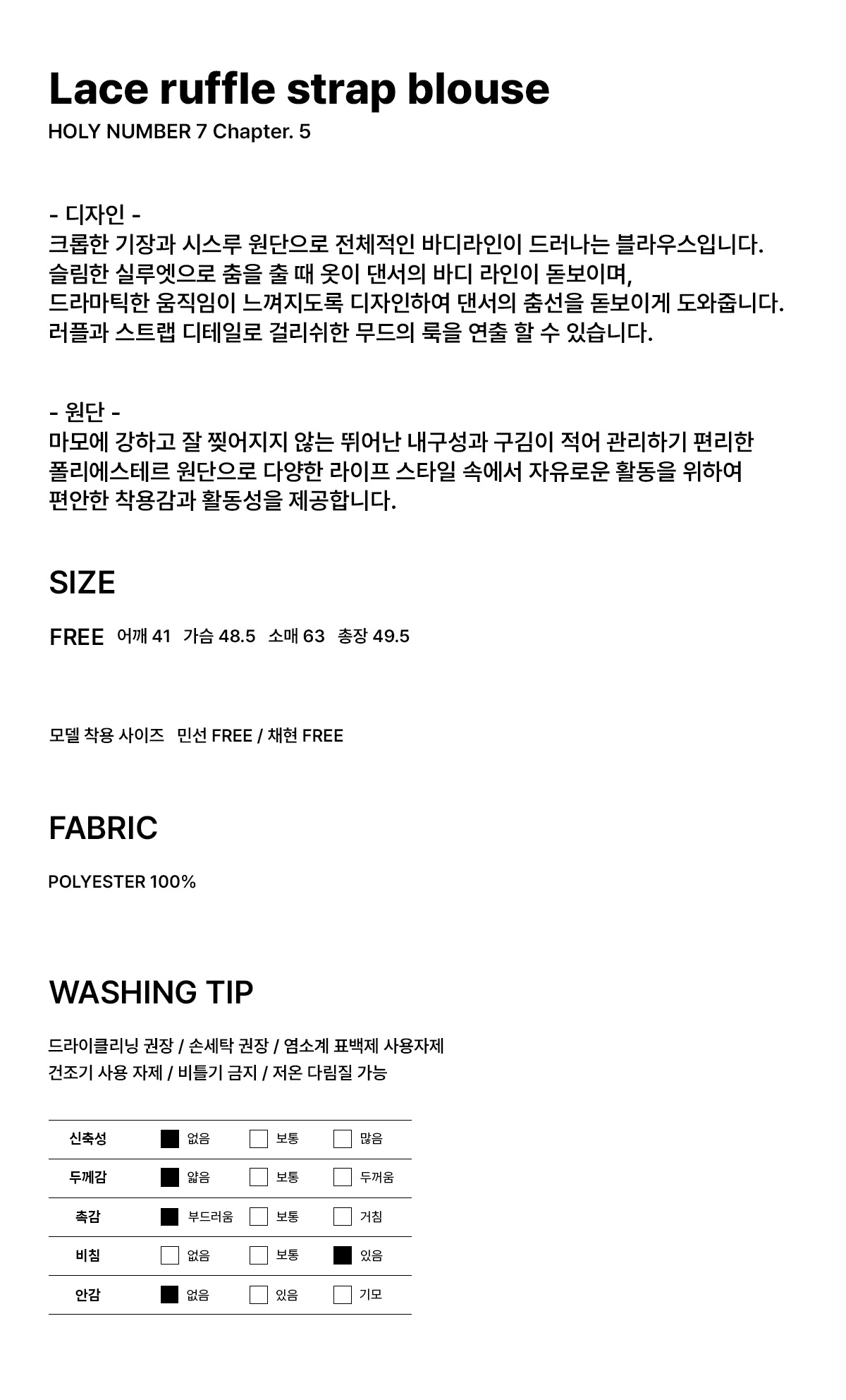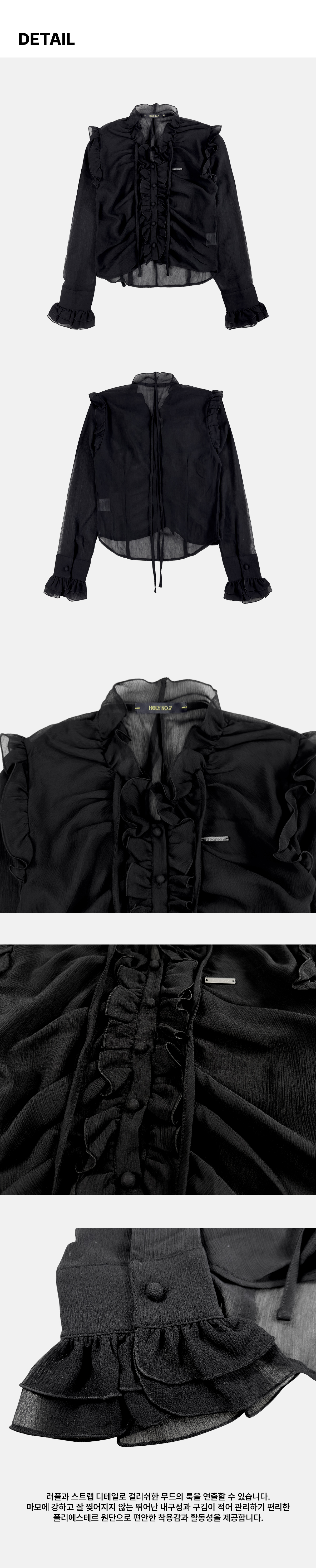 네크를 따라 흐르는 러플과 시스루한 소재가 여성스러운 느낌을 주는 블라우스예요.