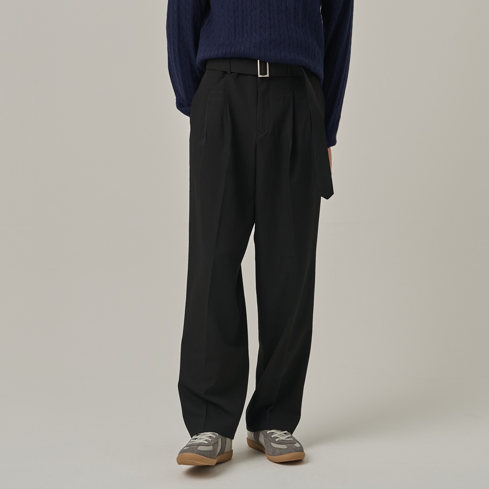 Belted Semi-Wide Slacks - Black