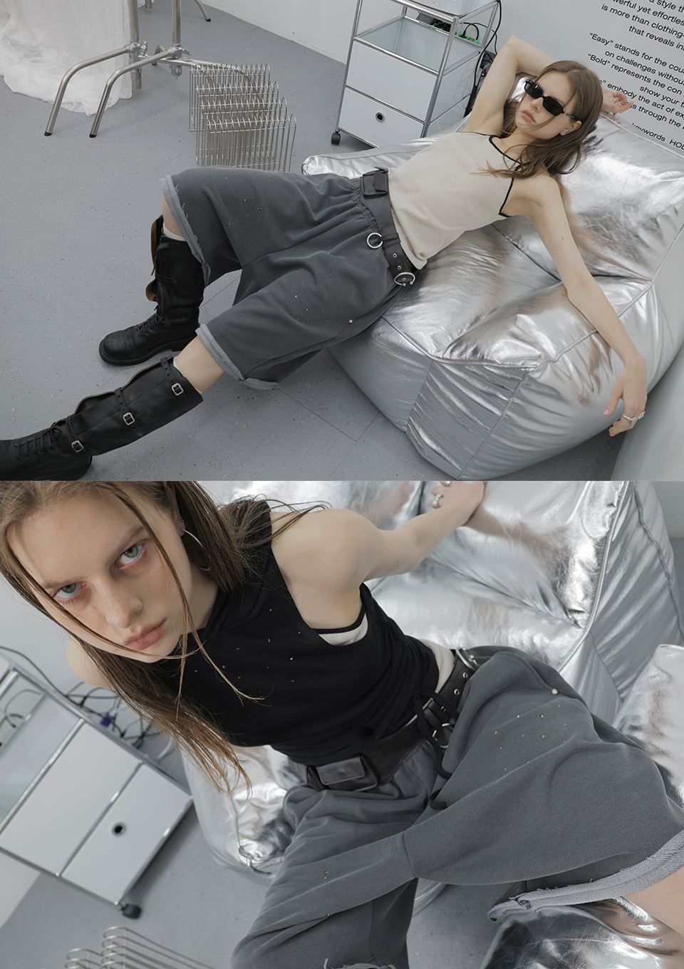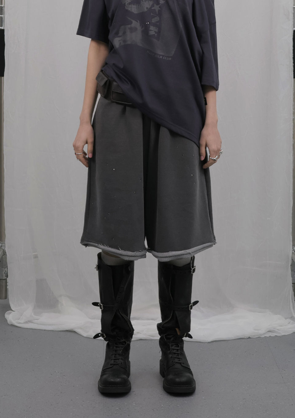 OVERSIZED HIP HOP WIDE FIT CUBIC SHORT PANTS_CHARCOAL
