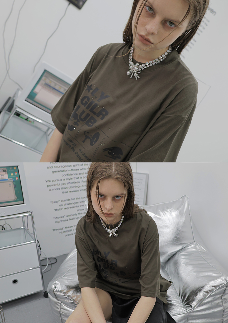 - 빈티지하고 펑키한 무드의 그래픽 위에 핫픽스를 더해 스트릿 감성과 반짝이는 에너지가 담겨있는 제품입니다.