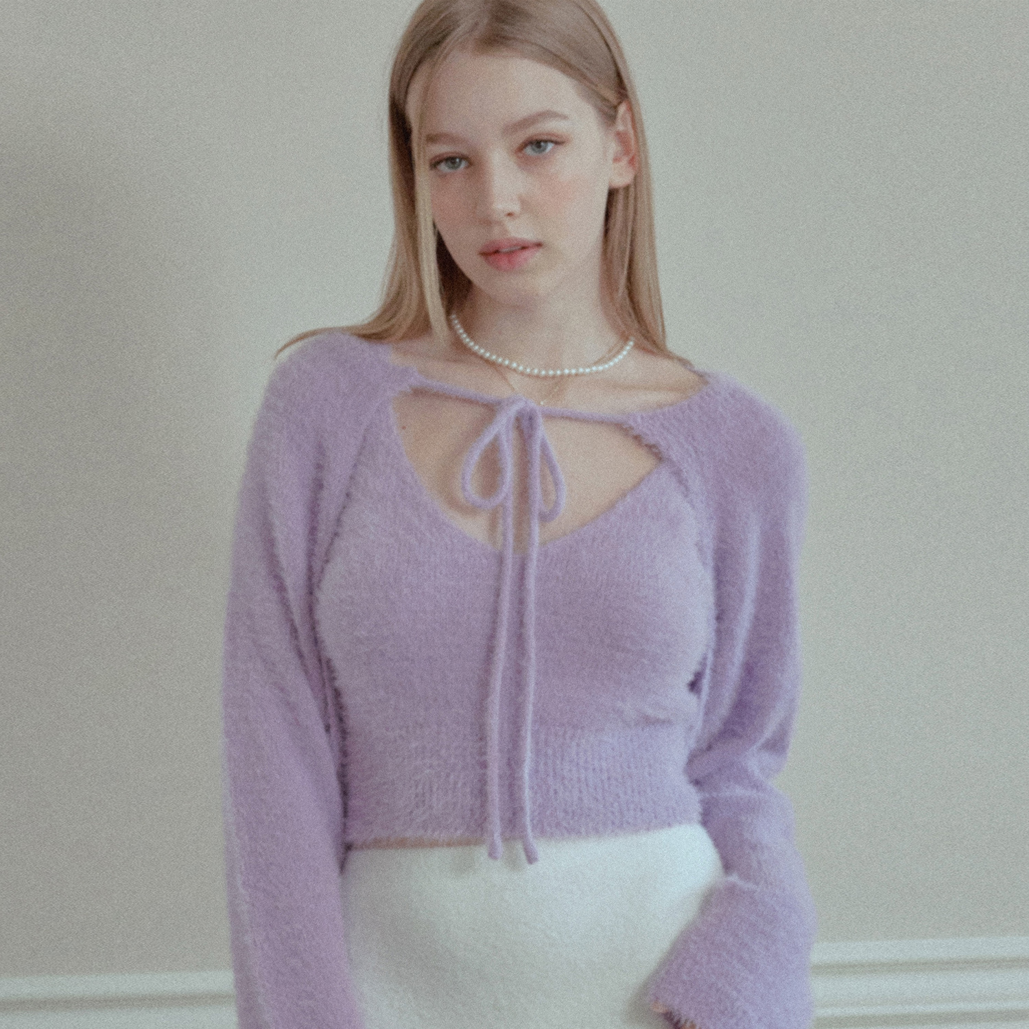 사선 플랩 형태의 비대칭 넥라인 디자인의 페미닌한 니트입니다.