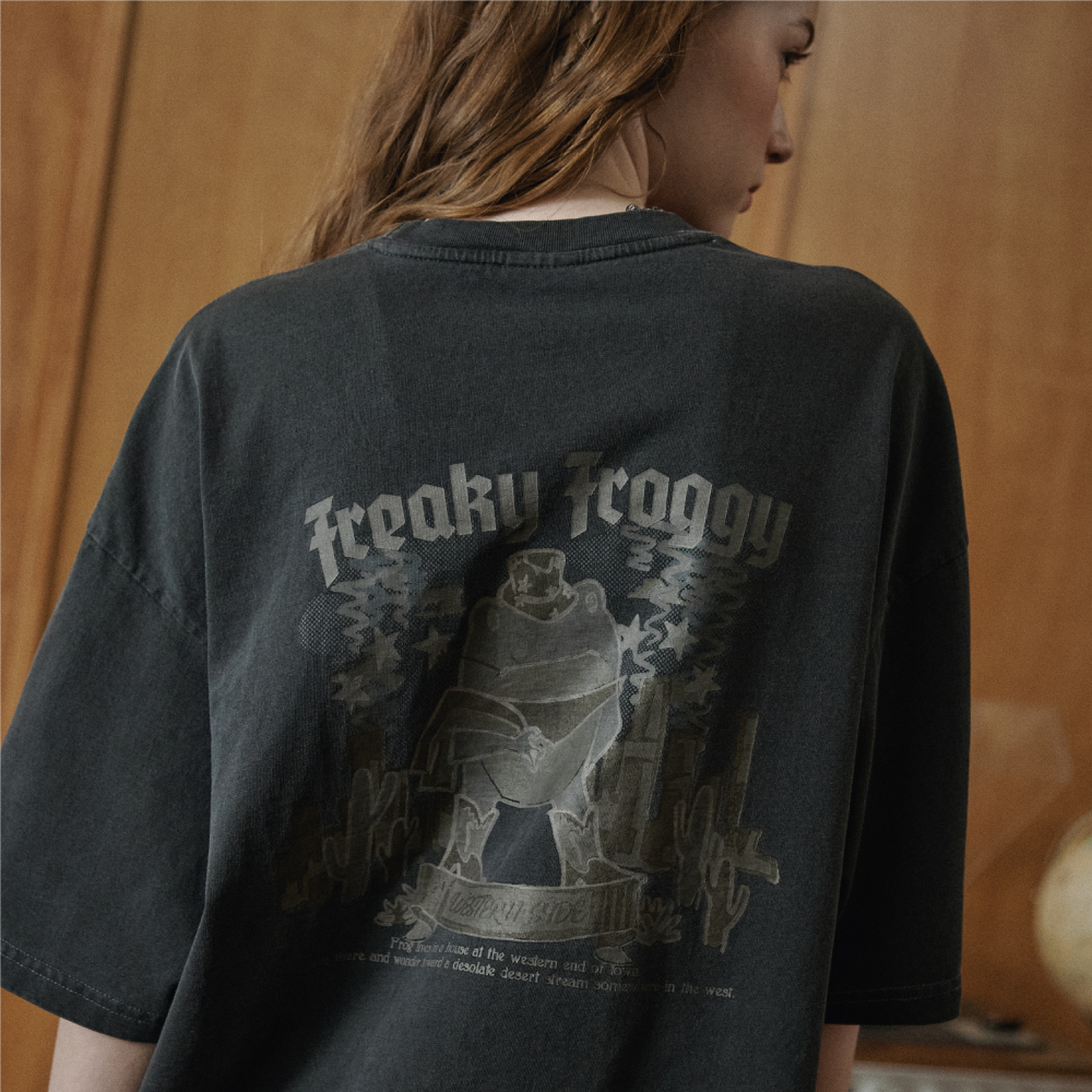아트웍이 피그먼트 워싱되며 가공 처리하여 유니크한 무드를 연출했습니다.
