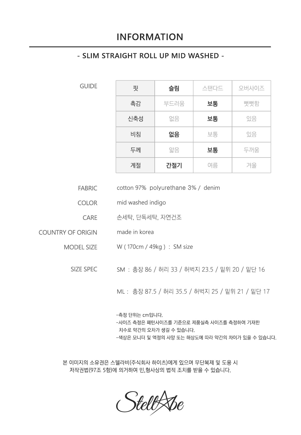 스텔라비 데님 라인의 중청 슬림 스트레이트 제품으로 중간길이의 밑위 사이즈 적용으로 편안하면서도 핏감이 우수한 아이템입니다.