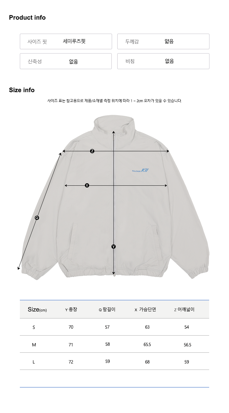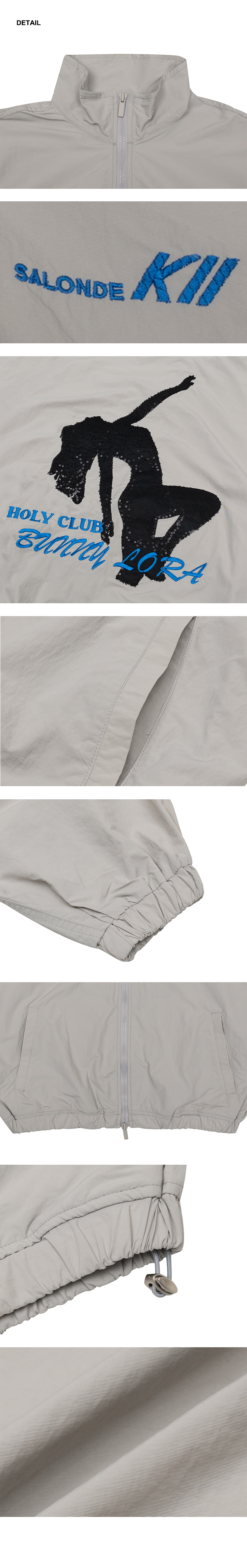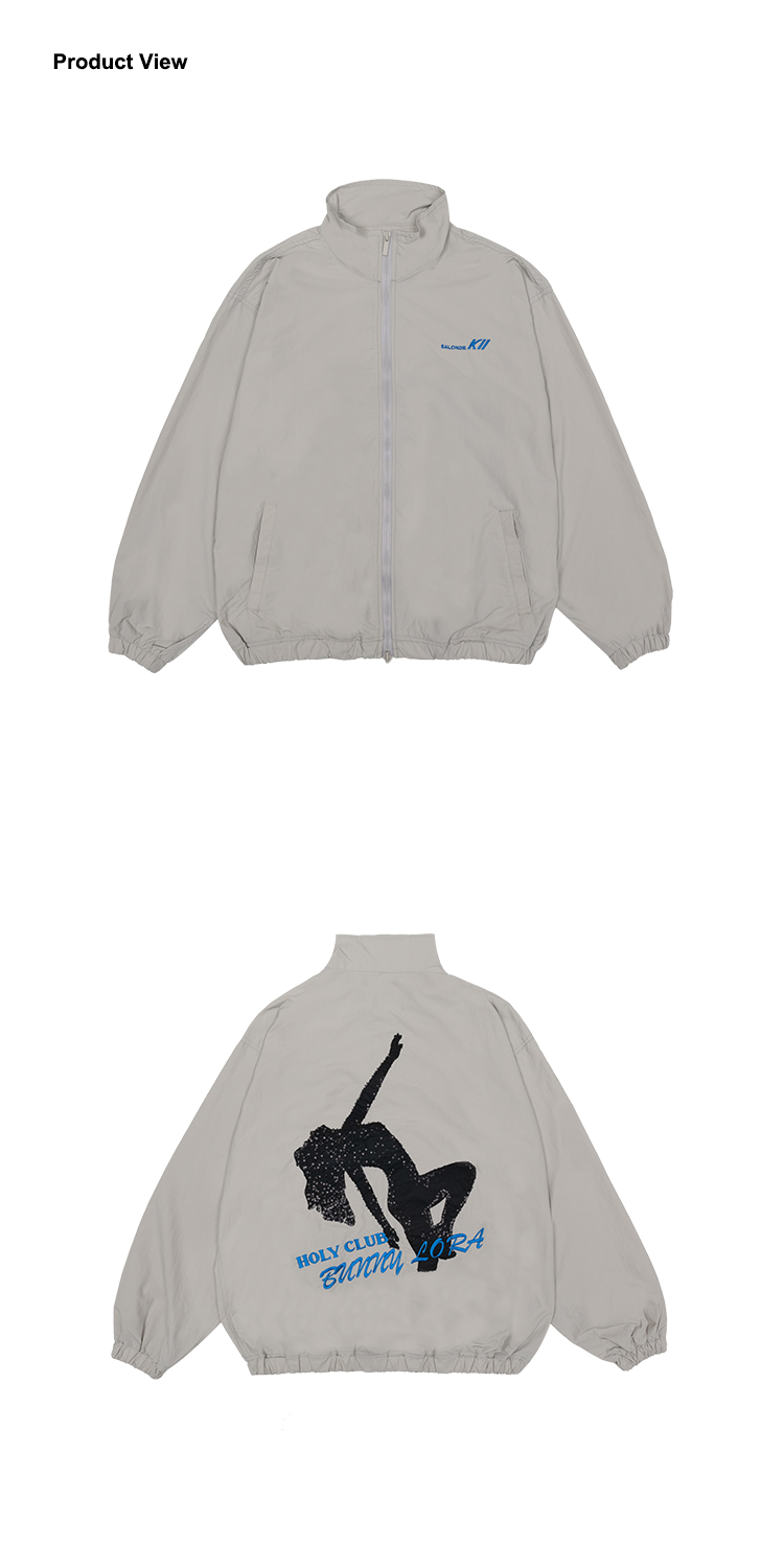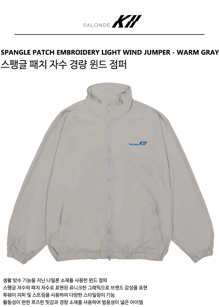 생활 방수 기능의 나일론 소재를 사용한 윈드 점퍼로 스팽글 자수와 패치 자수로 표현된 유니크한 그래픽으로 브랜드 감성을 표현했으며, 투웨이 지퍼 및 스트링을 사용하여 다양한 스타일링이 가능한 활동성이 편한 루즈한 핏감과 경량 소재를 사용하여 범용성이 넓은 아이템입니다.
