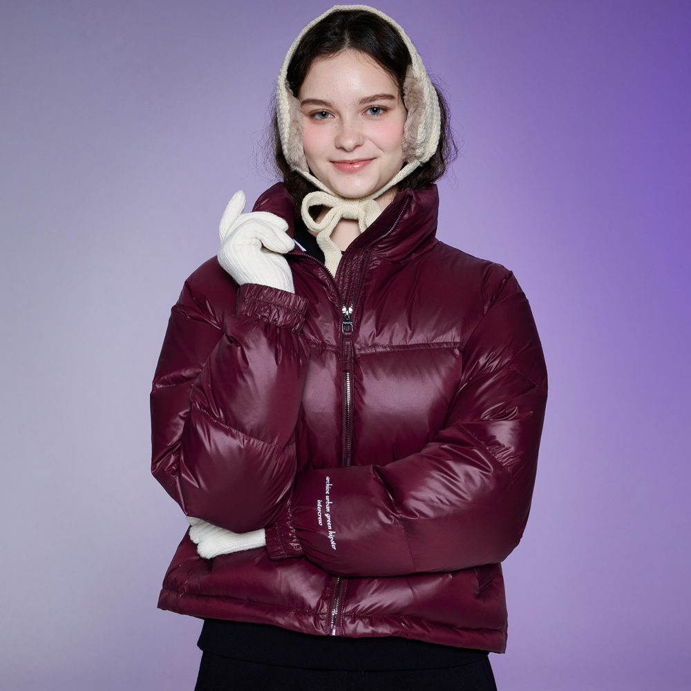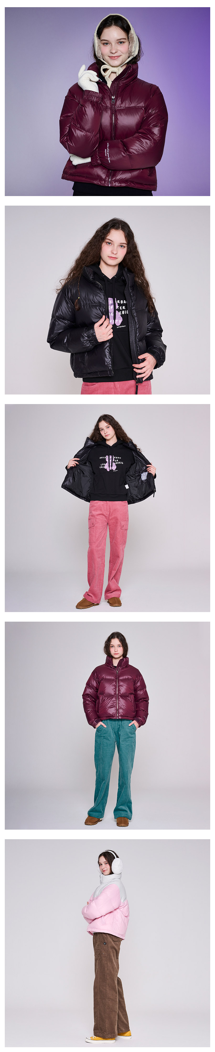 여유 있는 실루엣과 소매에 스냅 장식이 있는 유니크한 다운 점퍼입니다.