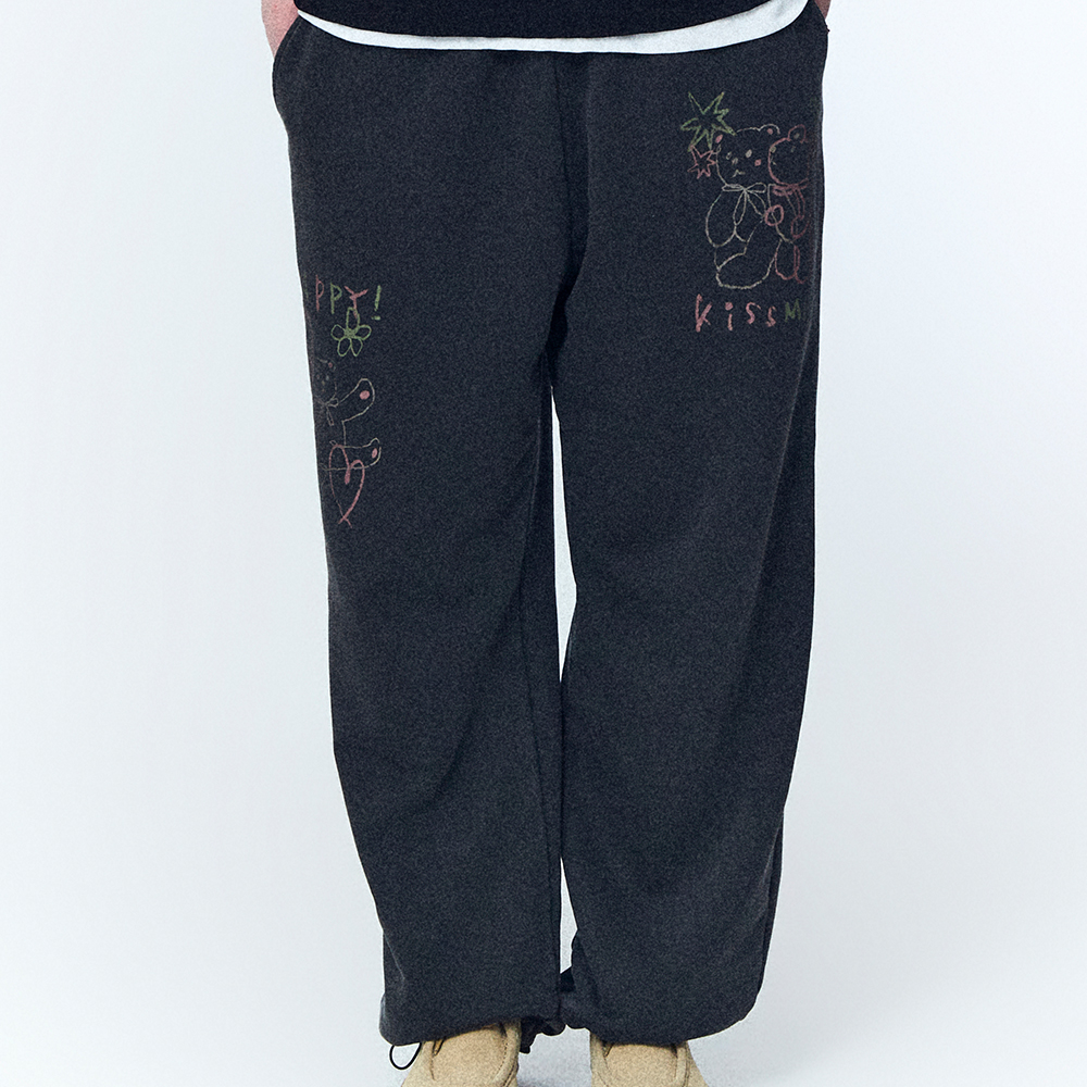 와이드한 패턴으로 볼륨감 있게 연출되며 전면에 그래픽 디자인이 매력적인 스웨트 팬츠입니다.
