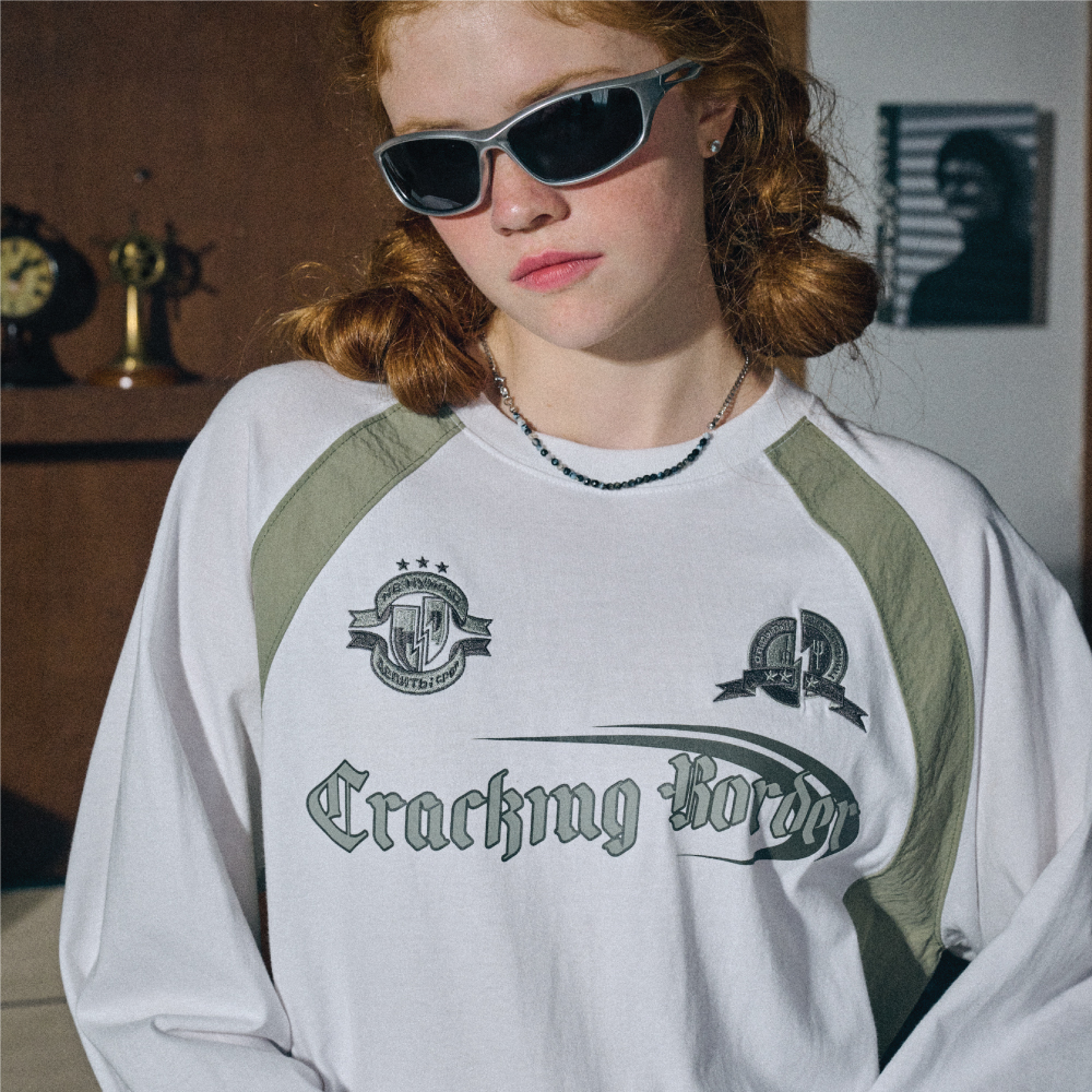 메쉬 원단으로 , 소매따라 심플한 레터링 오버핏의 긴팔 티셔츠