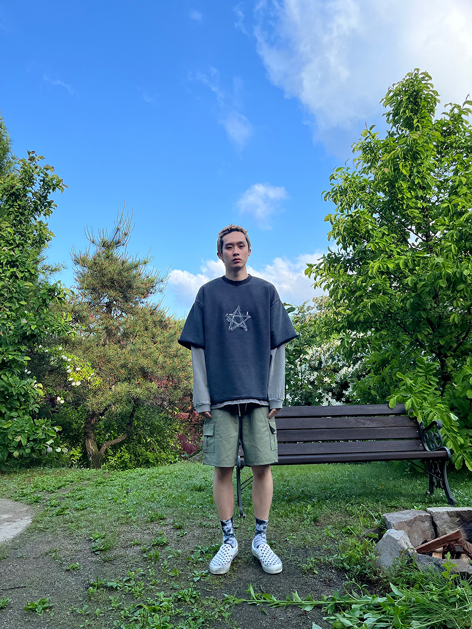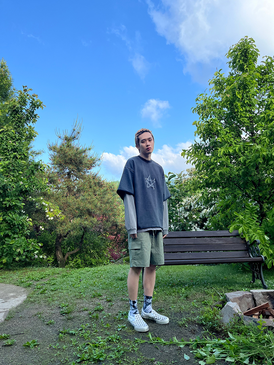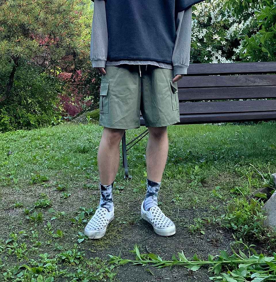 어른의 음료 알코올 진로의 컬러칩을 진하게 담은 데님 쇼츠입니다.