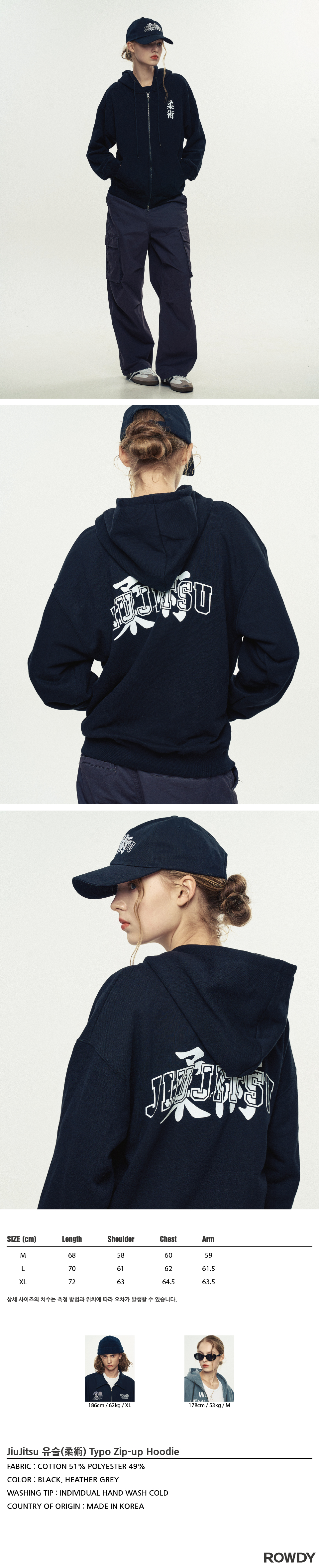 - 남성모델 : 186 / 62 XL사이즈 착용