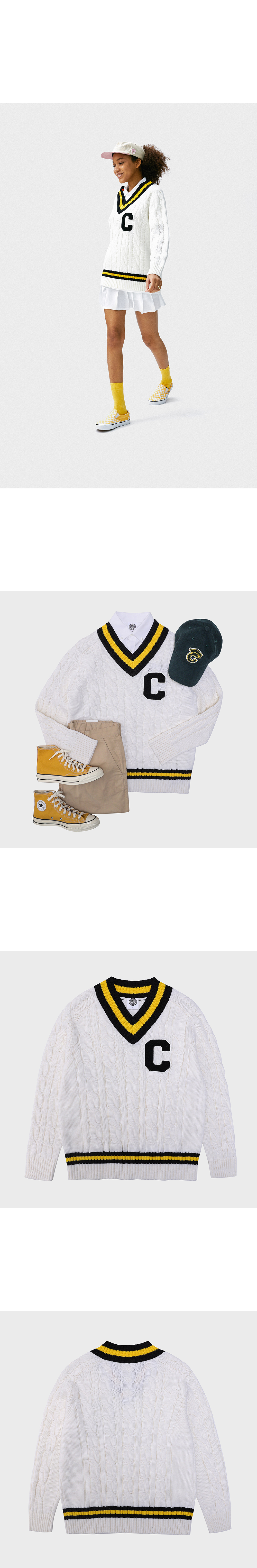C Patch Ivory Preppy V-Neck Wool Knit (Unisex)