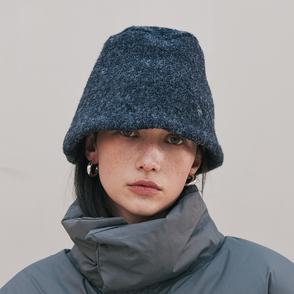 스트링 디테일로 안정감 있게 착용되는 니트 비치 버킷햇