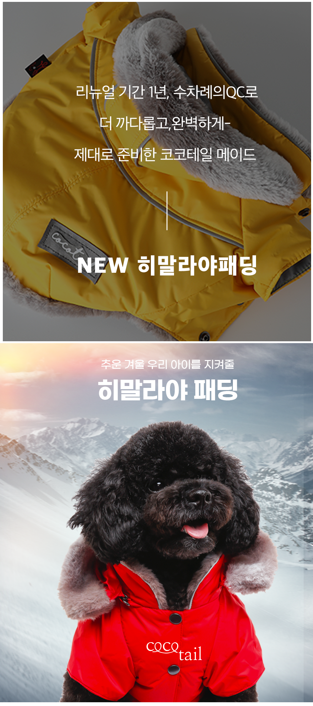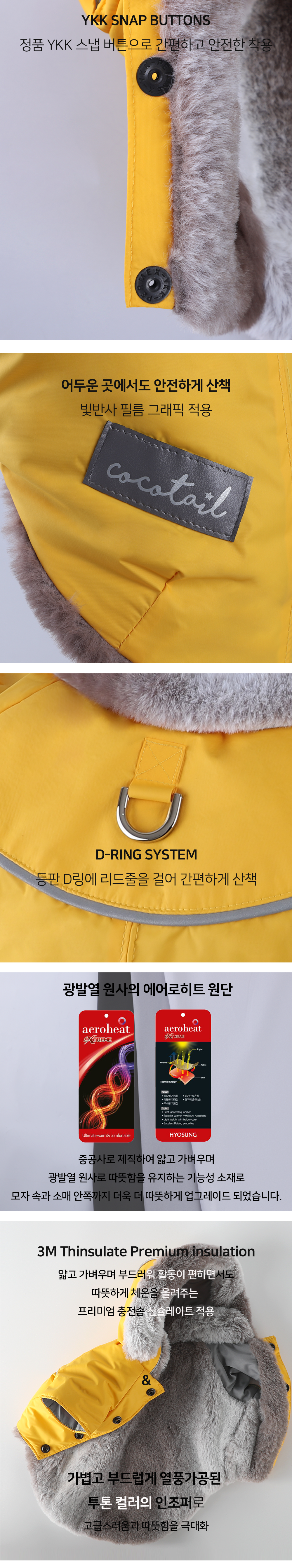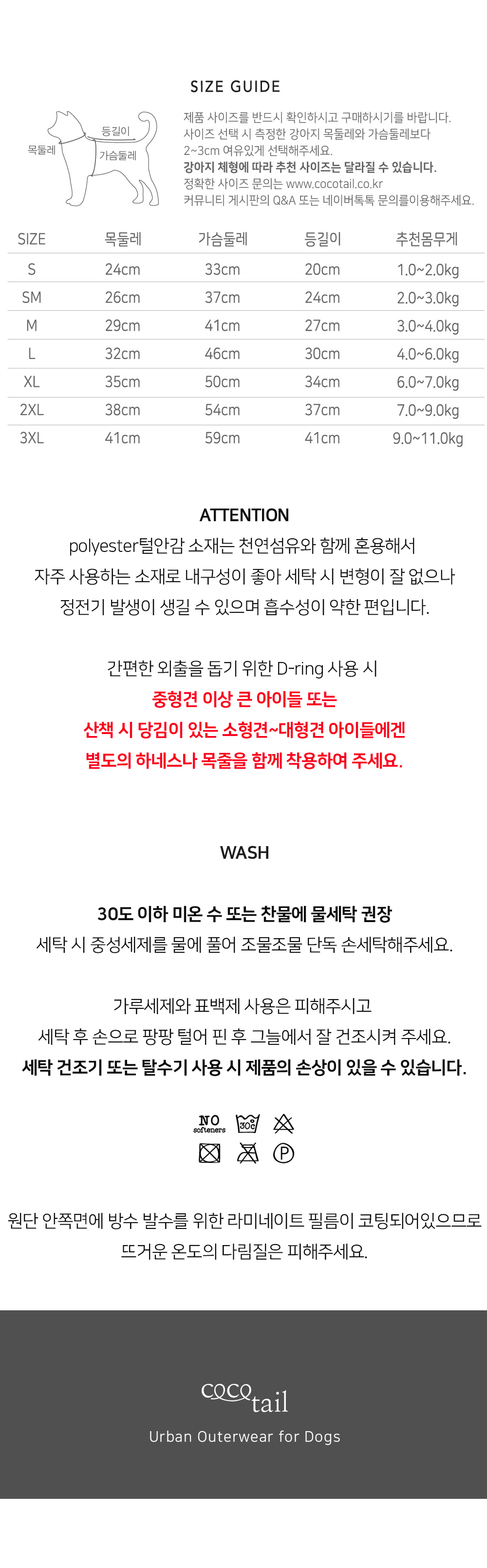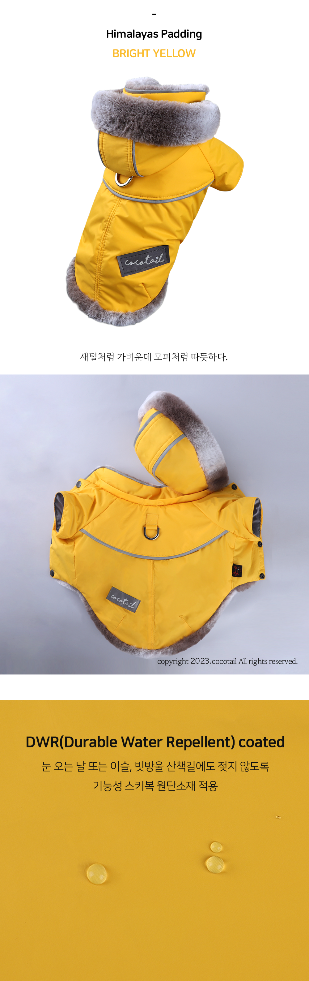 겨울철 눈 오는 날, 가벼운 비에도 댕댕이들과의 안전하고 따뜻한 산책길에 도움을 주는 하이퀄리티 기능성 패딩으로 꾸준한 사랑을 받고 있는 코코테일의 베스트셀러이자 스테디셀러 아이템입니다.
