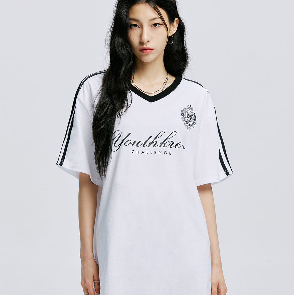 캐주얼한 스트라이프와 럭비 카라 디테일로 스포티한 무드를 살린 반팔 티셔츠