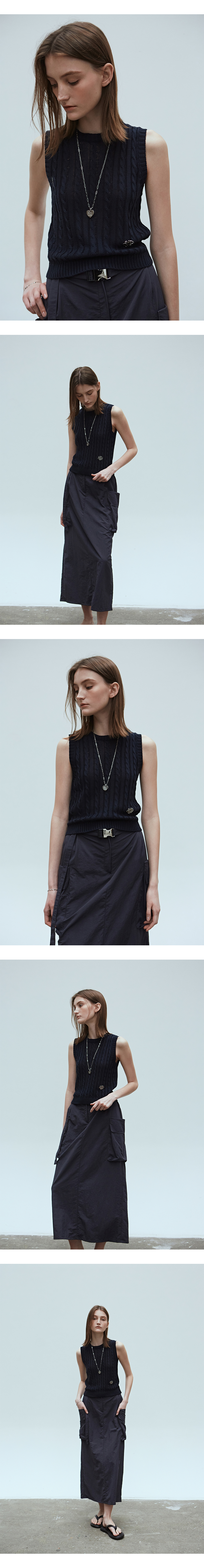회색 도트 패턴이 더해진 블랙 소재 위로 언밸런스한 핀턱과 밑단 스트랩 디테일로 입체적인 포인트를 더한 나시입니다.