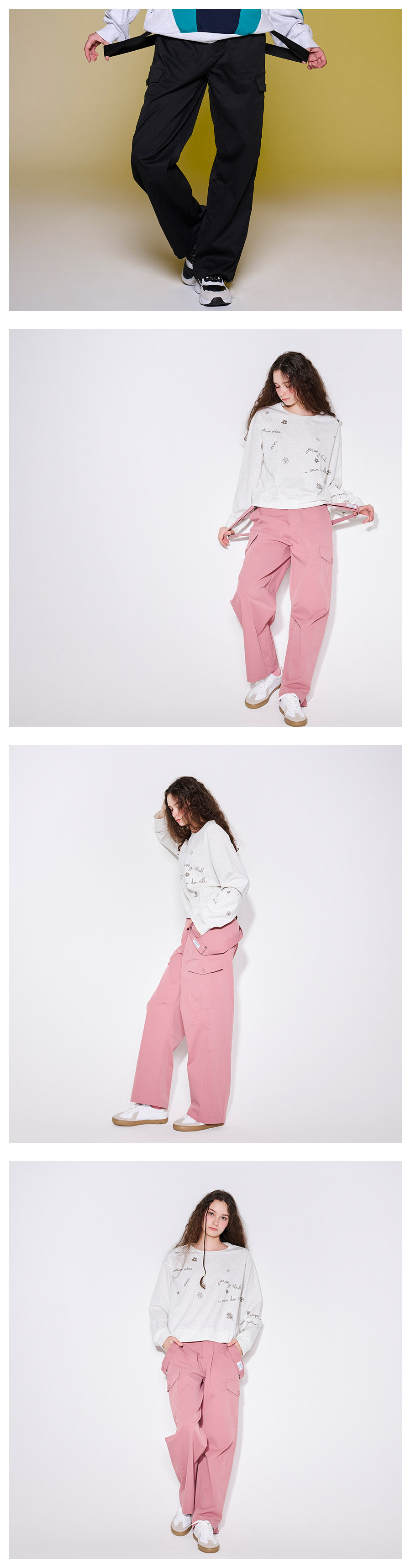 포켓과 스트랩으로 완성한 유니크한 실루엣의 스트링 조거 팬츠
