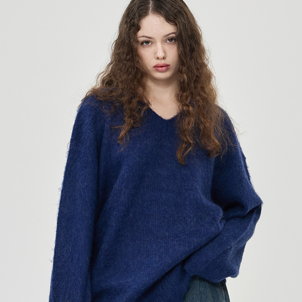 사선 플랩 형태의 비대칭 넥라인 디자인의 페미닌한 니트입니다.