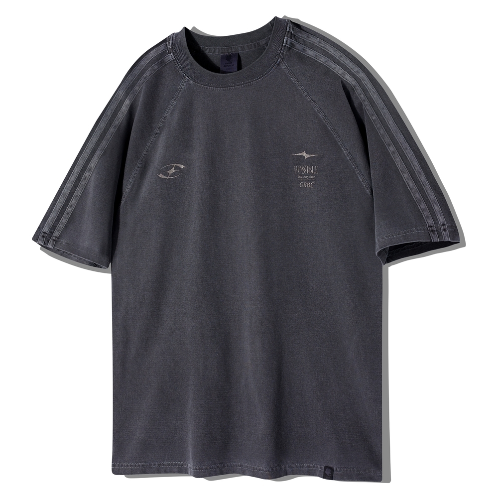 피그먼트 원단에 심플한 로고와 소매 두줄의 디테일로
