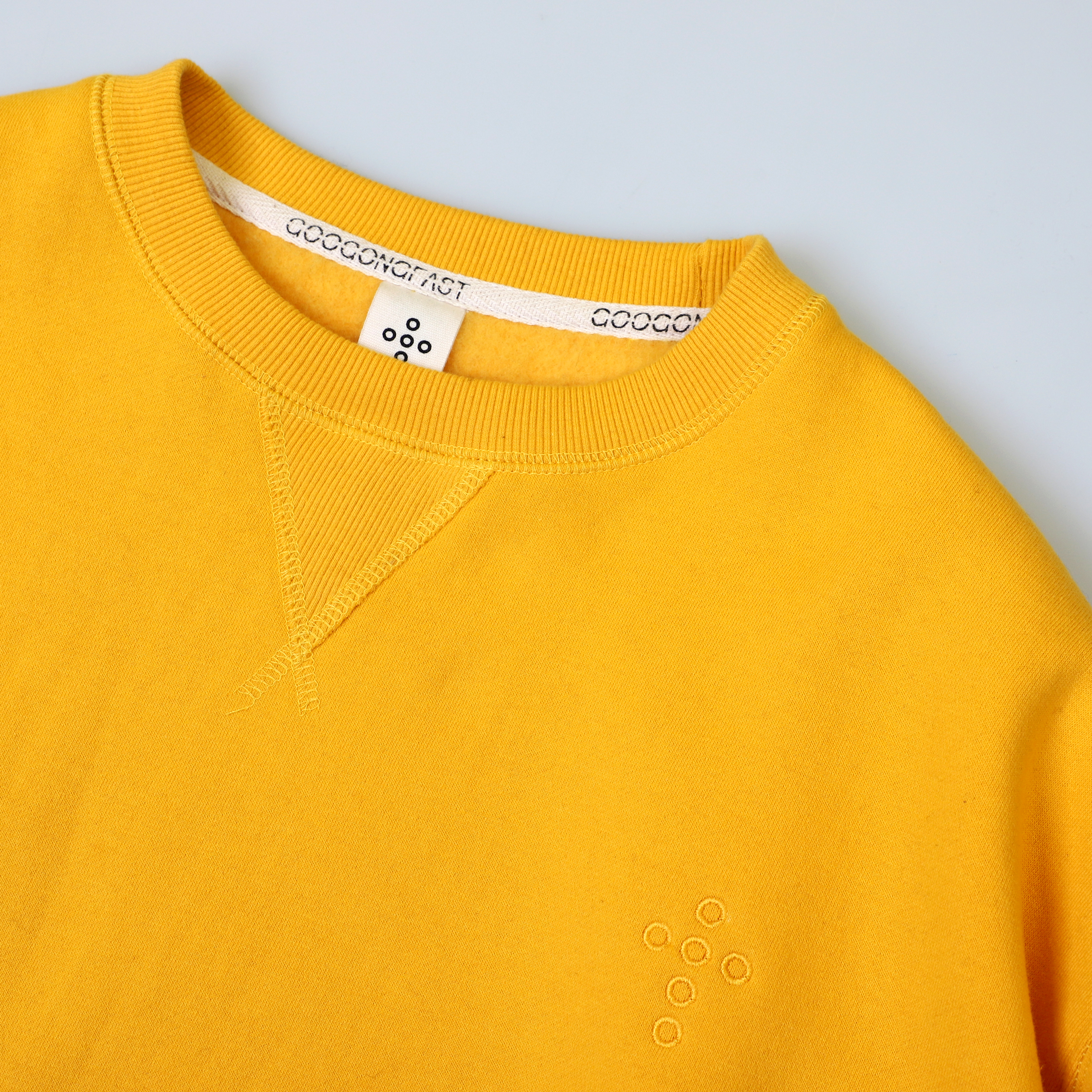 부드럽고 도톰한 기모원단을 사용하였구요. 왼쪽 손목 라벨과 가슴에 로고 자수로 포인트를 주고 넥라인에 디테일을 추가하였습니다.