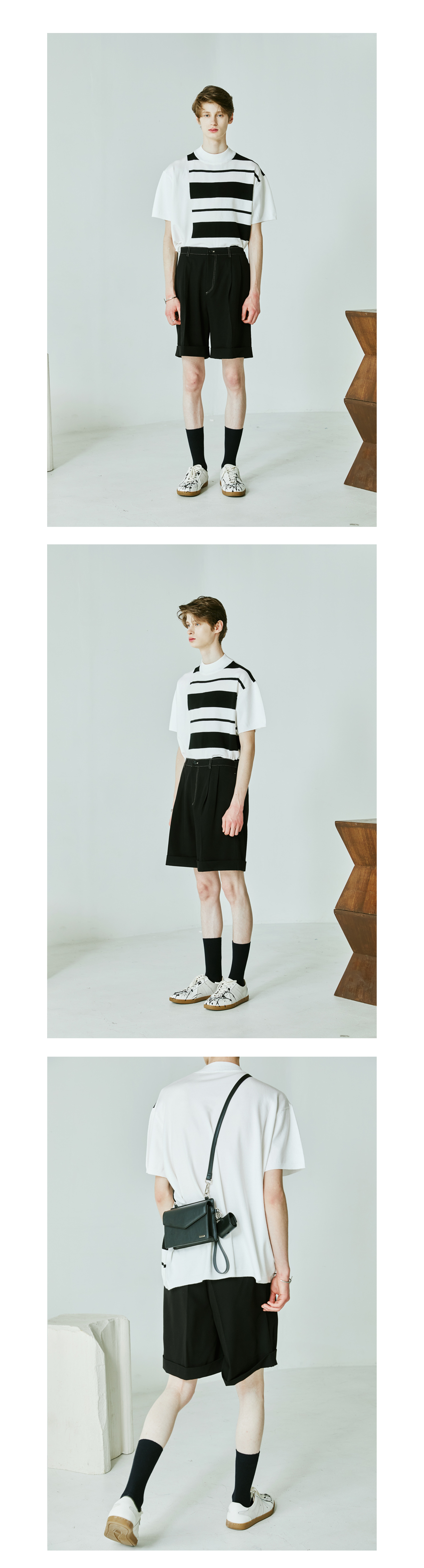 MOCK NECK HALF STRIPE KNIT T-SHIRT-WHITE