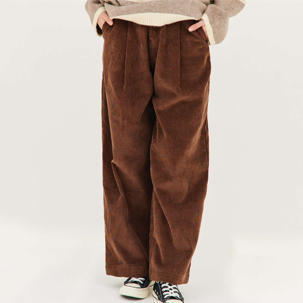 전면 원턱 디테일과 부드러운 터치감과 볼륨감 있게 떨어지는 매력적인 와이드 핏으로 다양한 스타일링에 활용할 수 있는 남녀공용 코듀로이 팬츠입니다.
